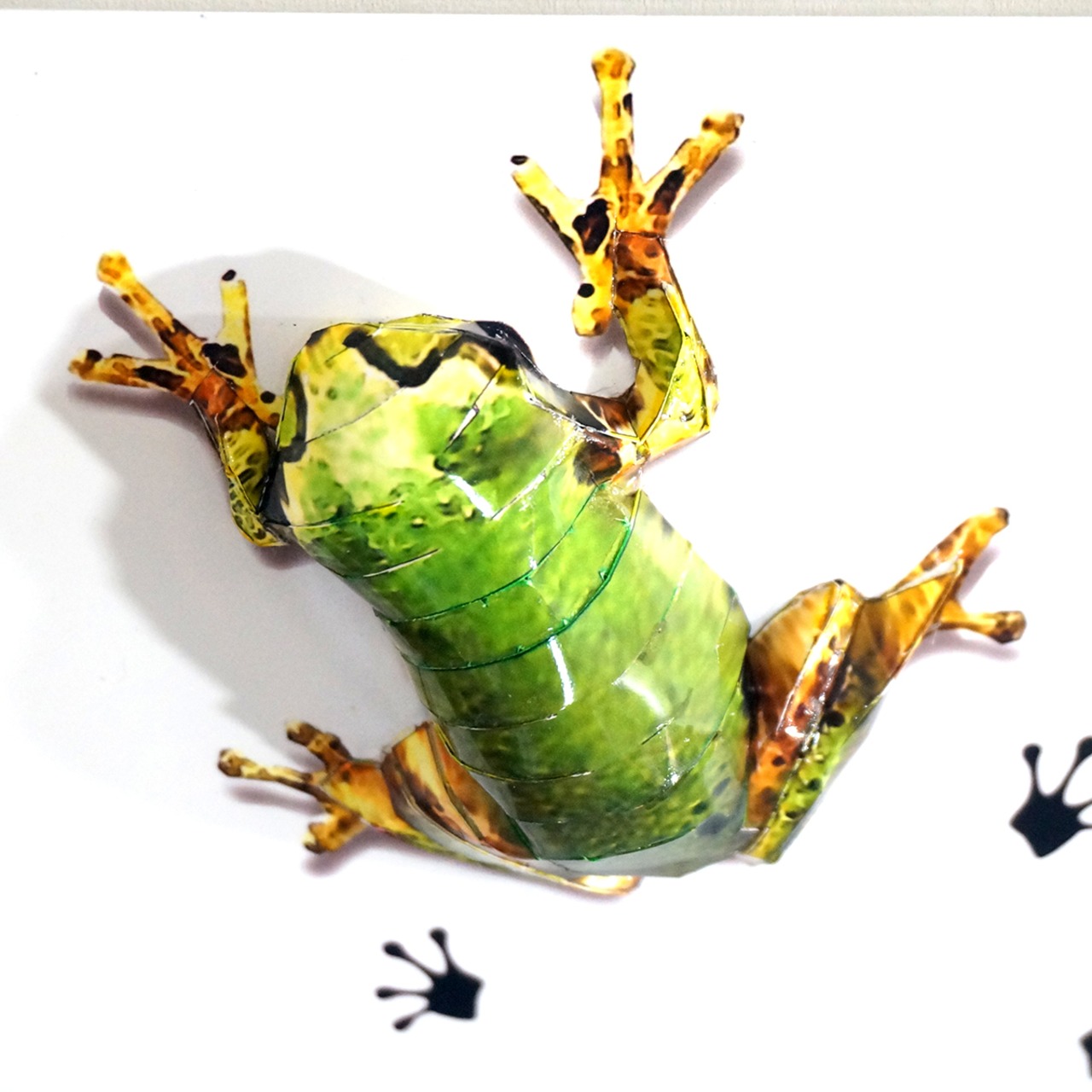 「アマガエルのコラージュ画像を作成しペーパークラフト技術を用いて立体的に表現した作品です。