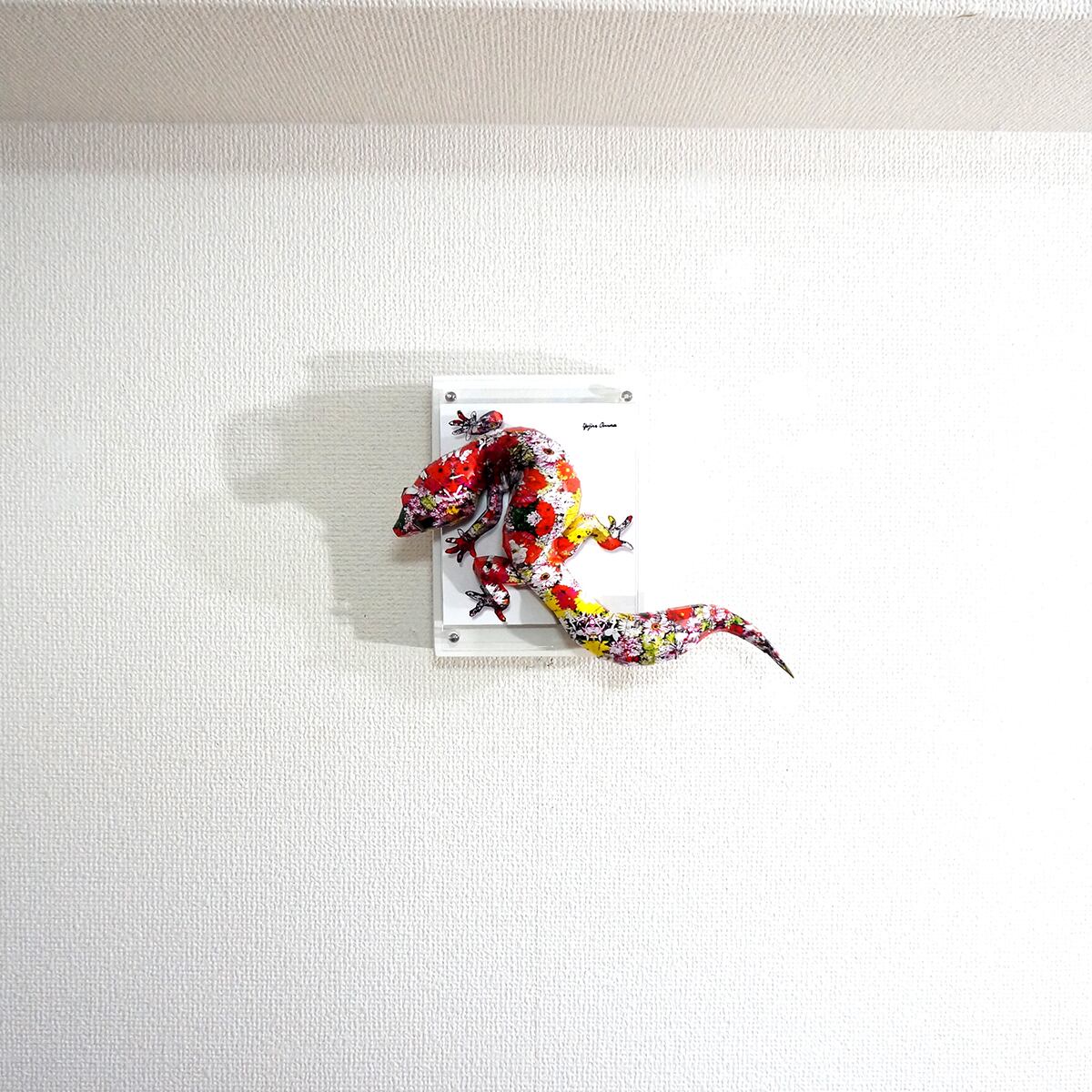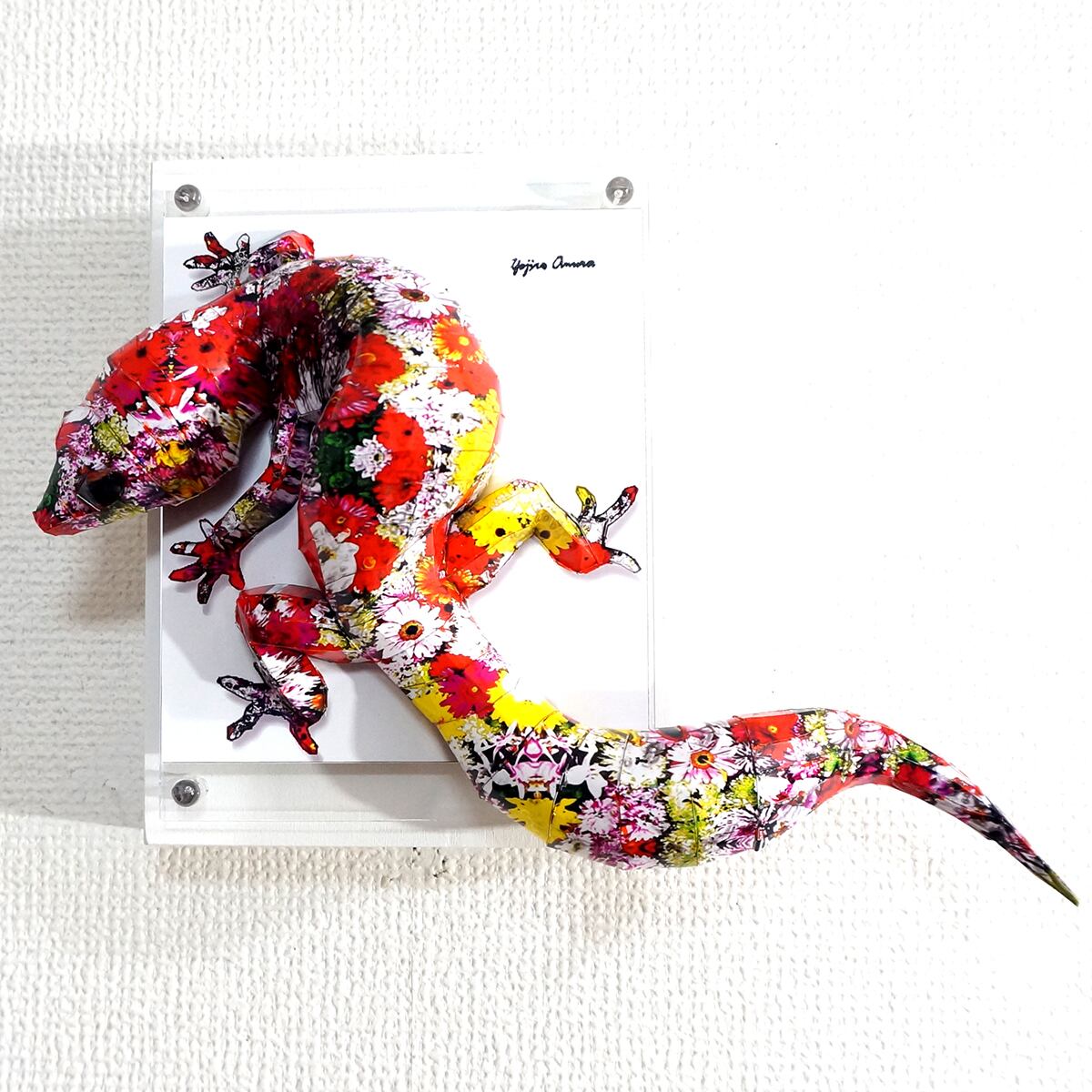 表面上はカラフルな花柄模様をトカゲ本来の表情と重ね合わせたデザインです。表面上は光沢紙の艶のある質感となっております。