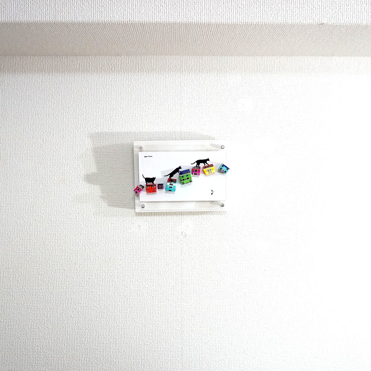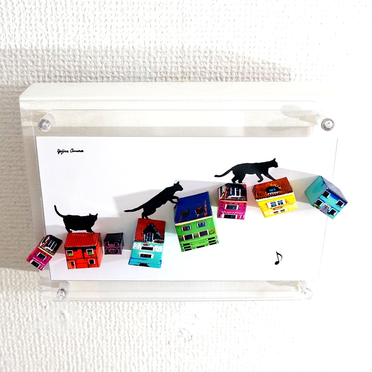 両サイドの家の端をパネルからはみ出させることで、猫たちがそのままパネルの外まで歩いてきそうな予感を感じさせるデザインになっております。