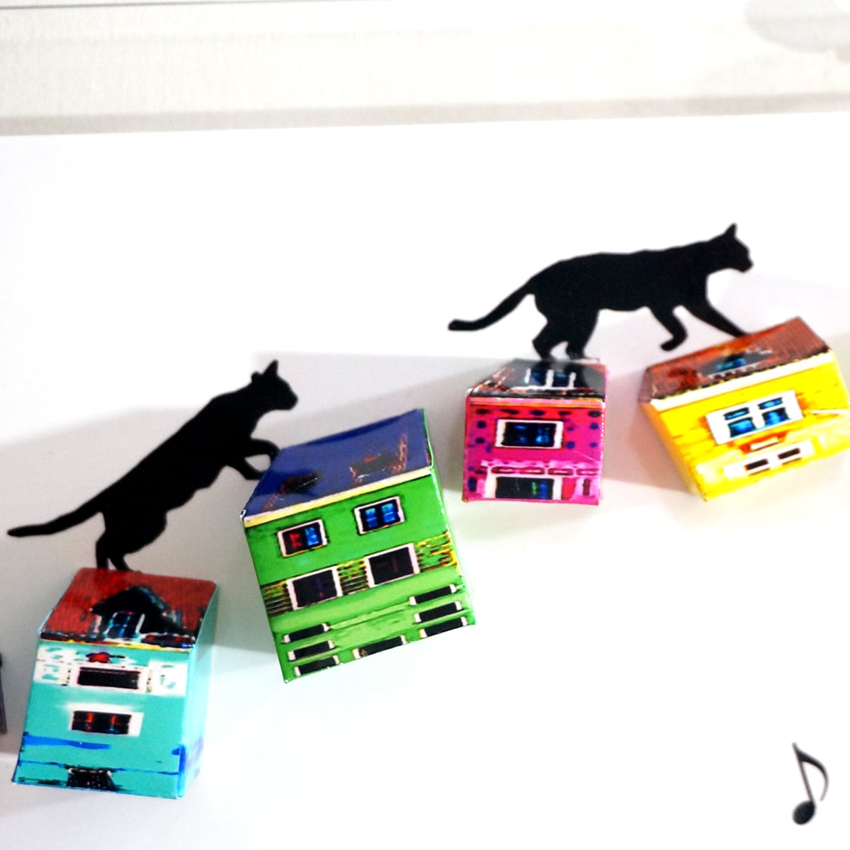「3匹の猫が宙に浮かんだ家の上を散歩する様子をペーパークラフト技術を用いて表した作品です。