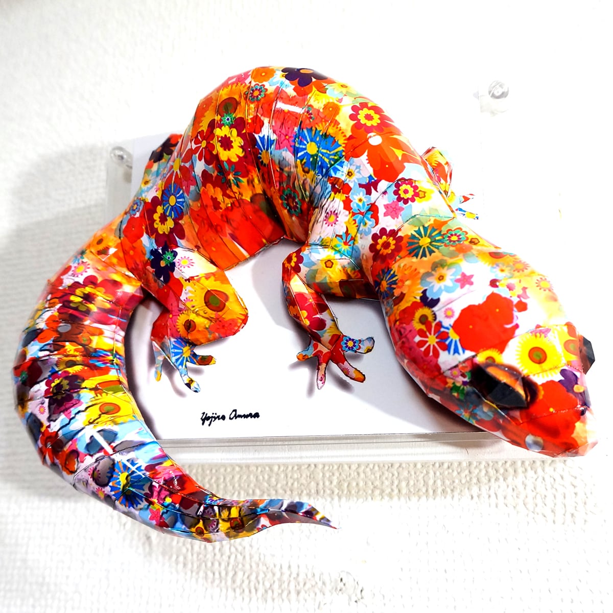 表面上はカラフルな花柄模様をトカゲ本来の表情と重ね合わせたデザインです。表面上は光沢紙の艶のある質感となっております。