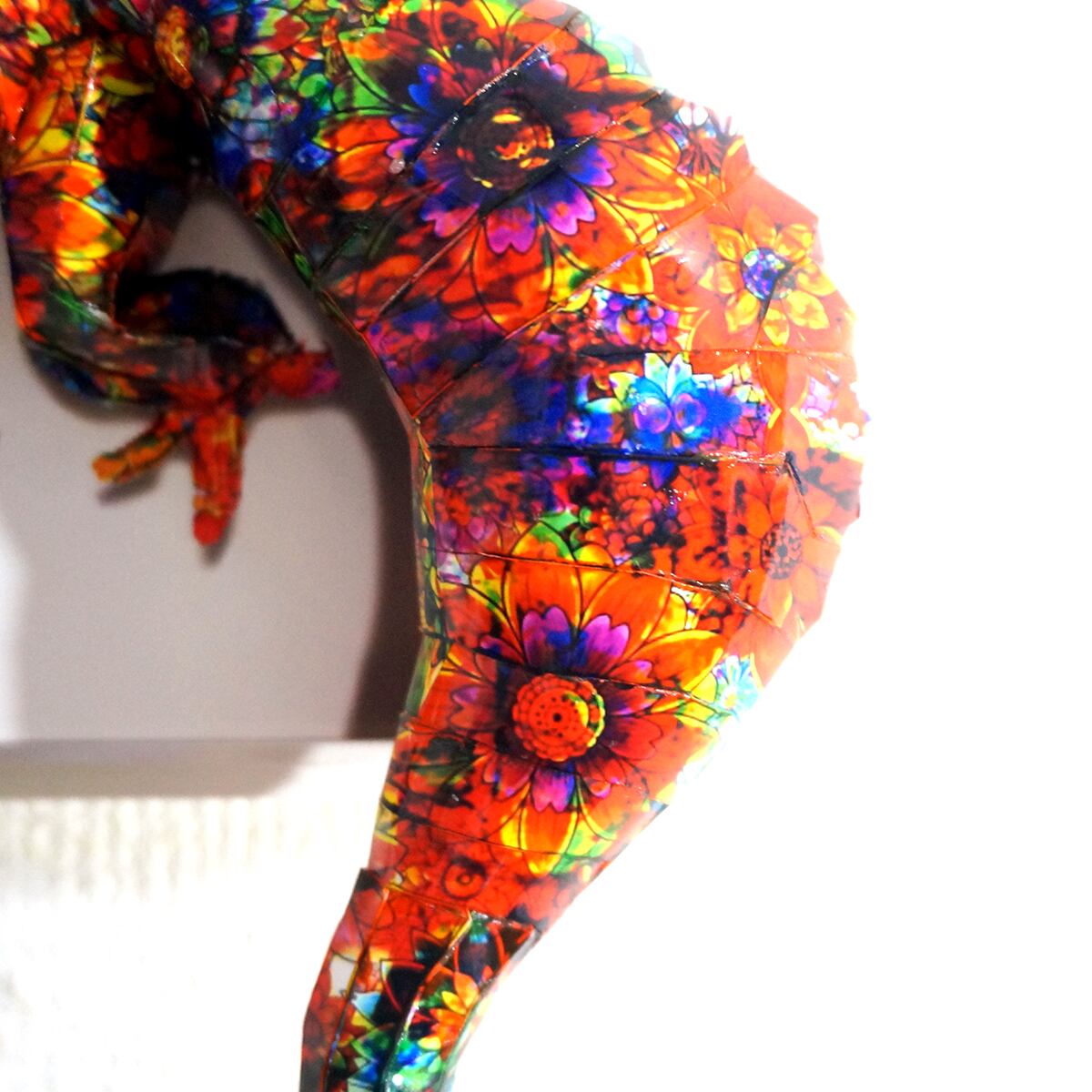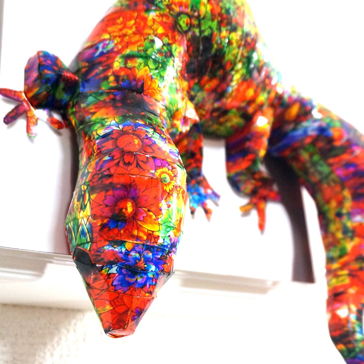 「こちらはトカゲのコラージュ画像を元にペーパークラフト技術を用いて立体的に表現した作品です。