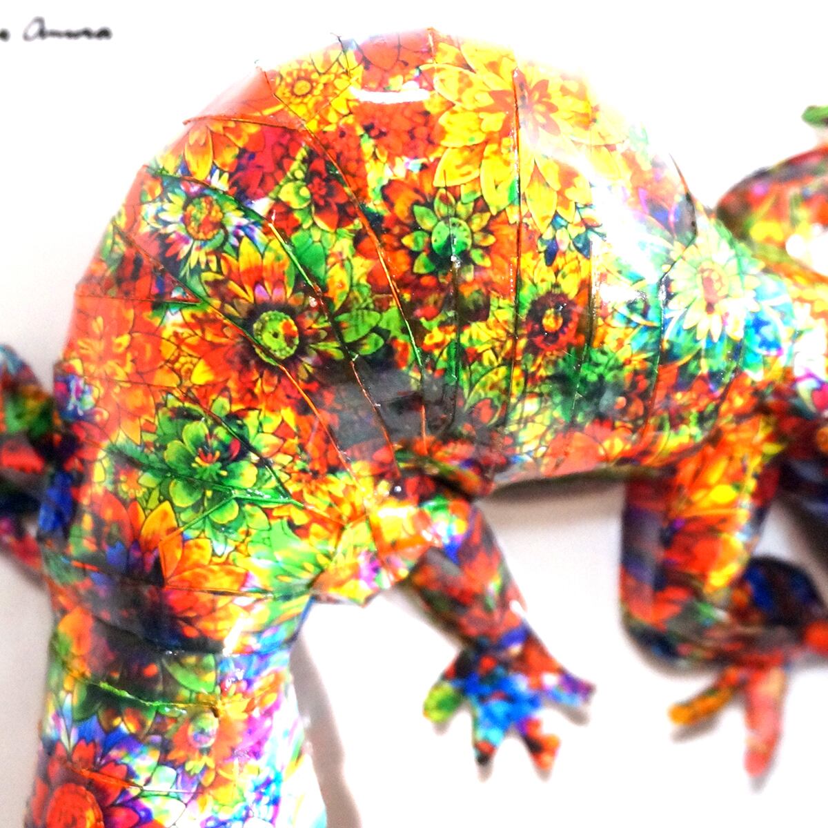 赤色を基調としたカラフルな模様をトカゲ本来の表情と重ね合わせたデザインです、表面上は光沢紙の艶のある質感となっております。