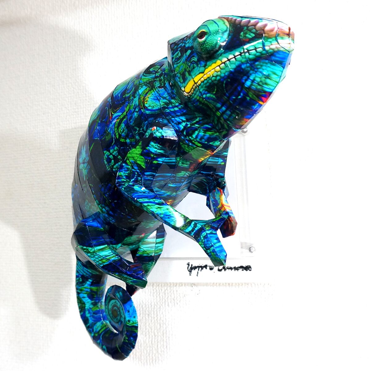 「カメレオンのコラージュ画像を元にペーパークラフト技術を用いて立体的に表現した作品です。