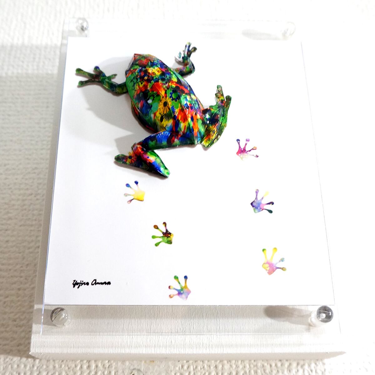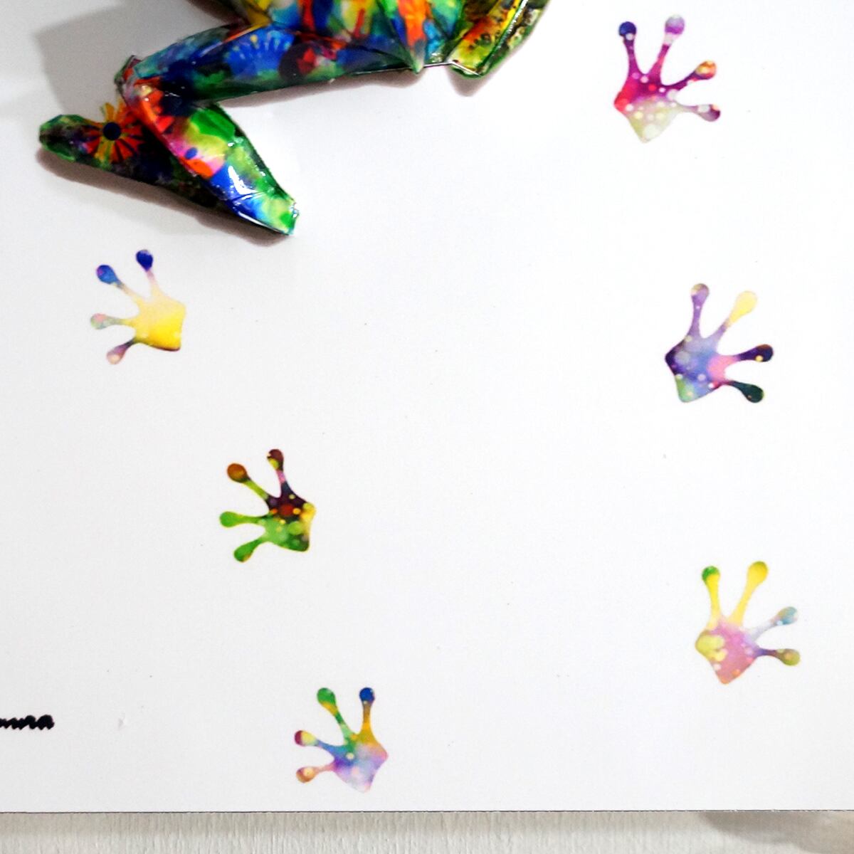 さまざまな色の模様に包まれたアマガエルが、彩りの足跡を残して進む可愛らしい構成に仕上げました。