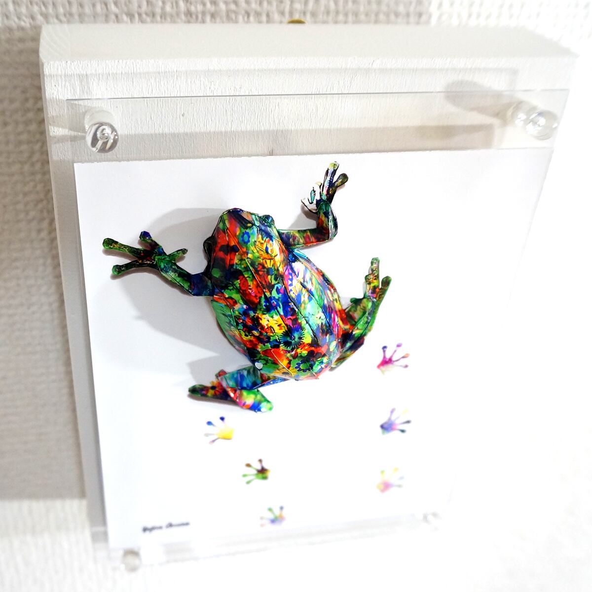 「アマガエルのコラージュ画像を作成しペーパークラフト技術を用いて立体的に表現した作品です。