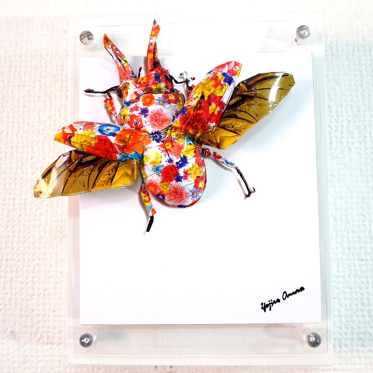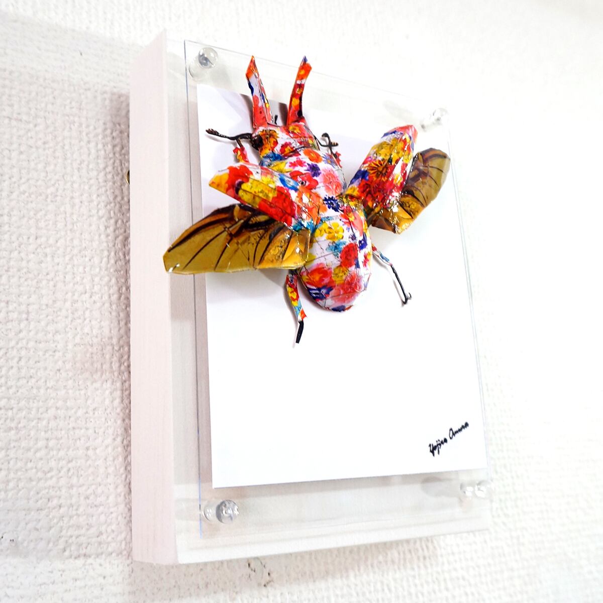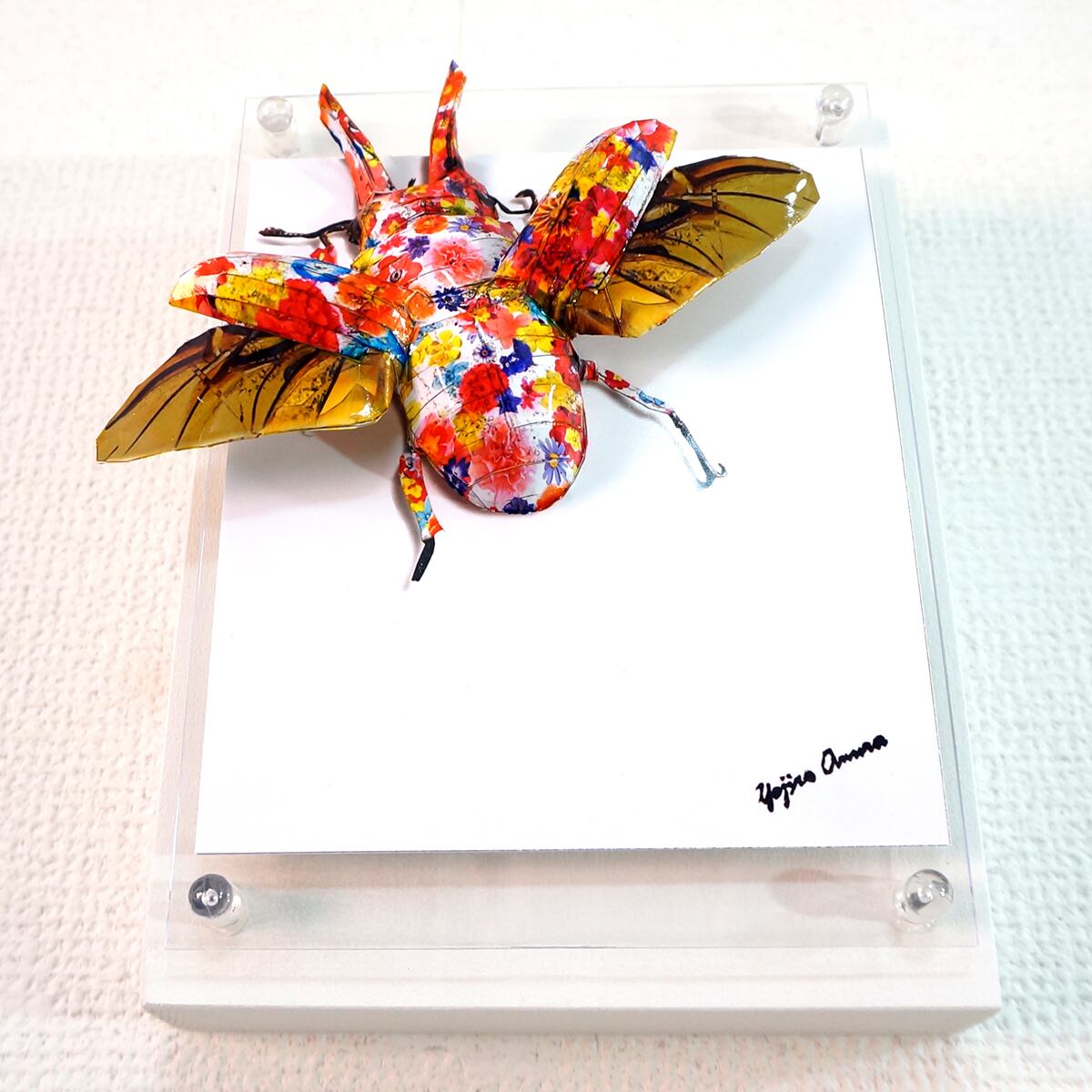 「ローゼンベルグオウゴンオニクワガタのコラージュ画像を作成しペーパークラフト技術を用いて立体的に表現した作品です。