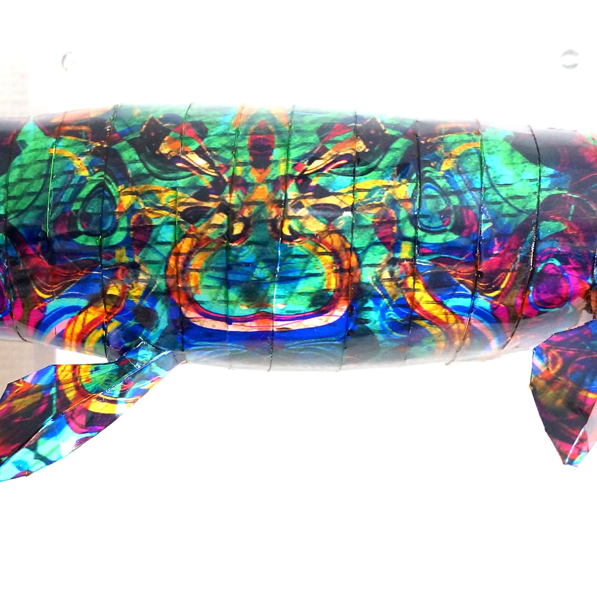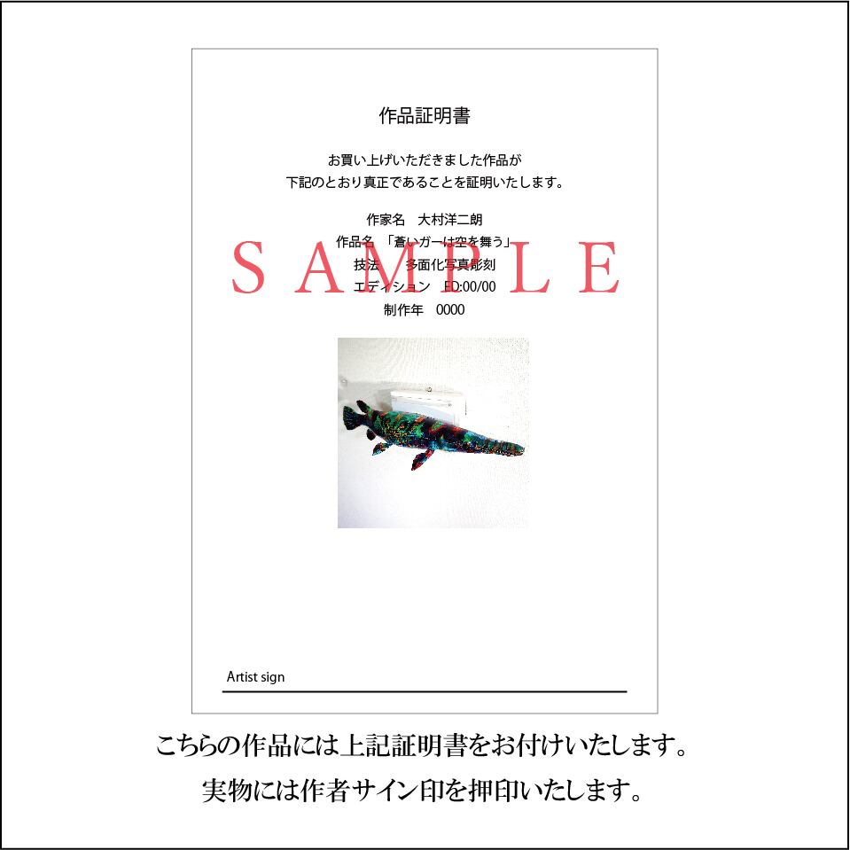 青を基調としたマーブリング模様をアリゲーターガーの本来の表情と重ね合わせたデザインです。表面上は光沢紙の艶のある質感となっております。