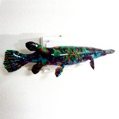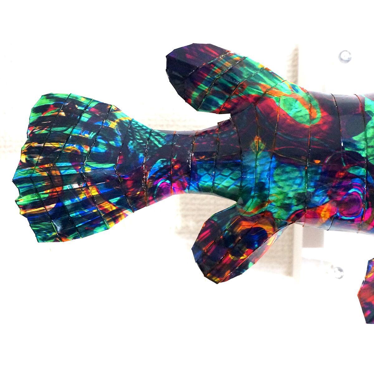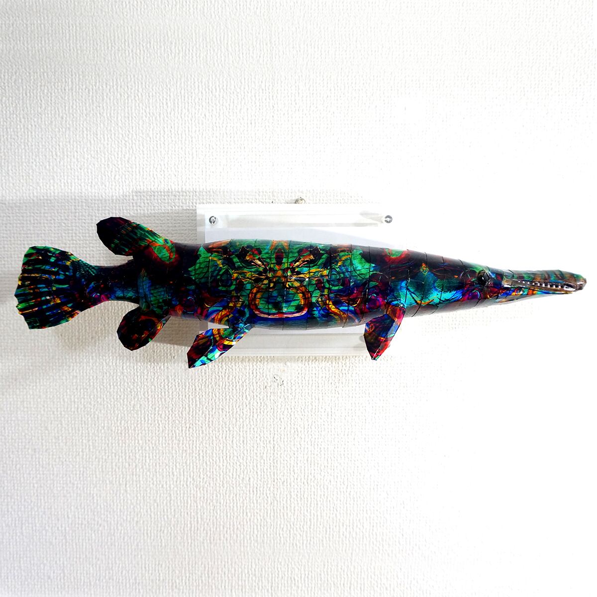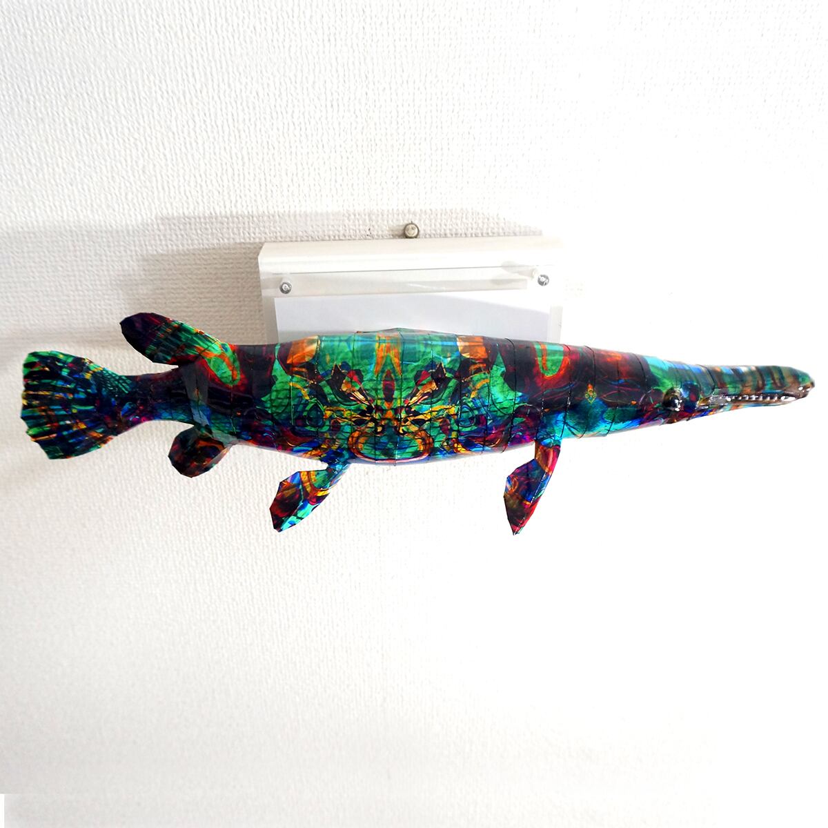 「アリゲーターガーをモチーフにコラージュ画像を作成しペーパークラフト技術を用いて立体的に表現した作品です。