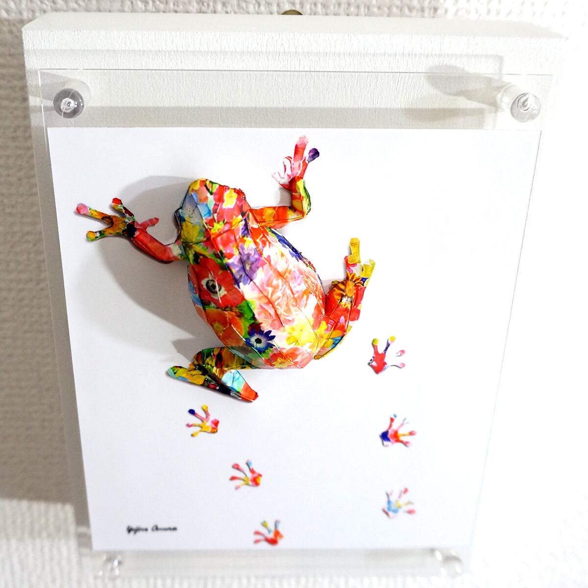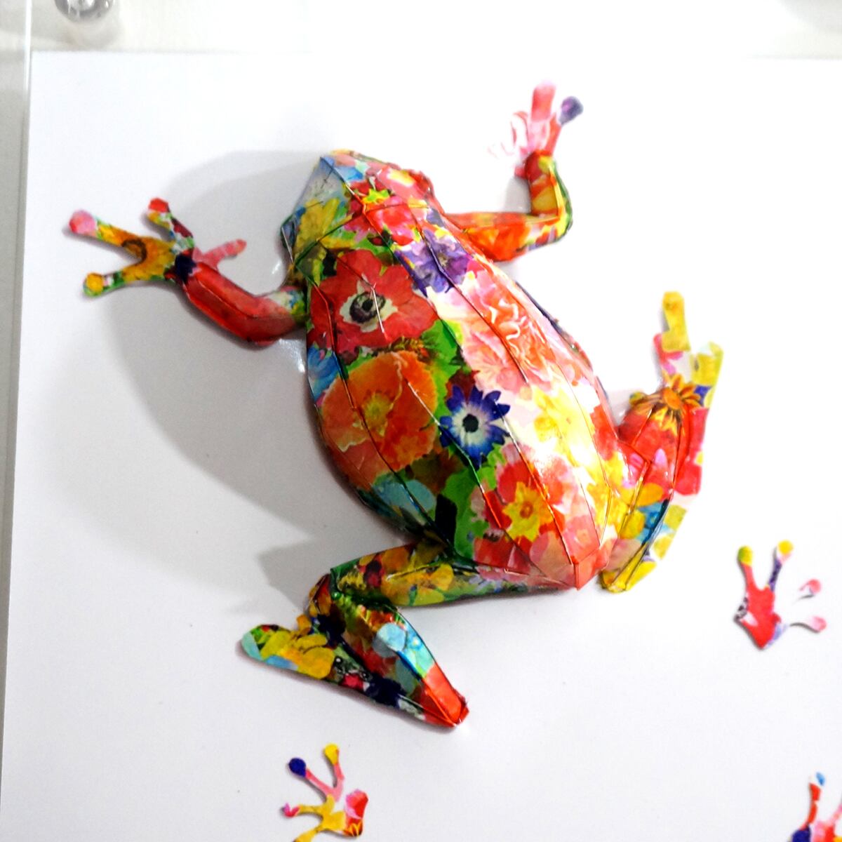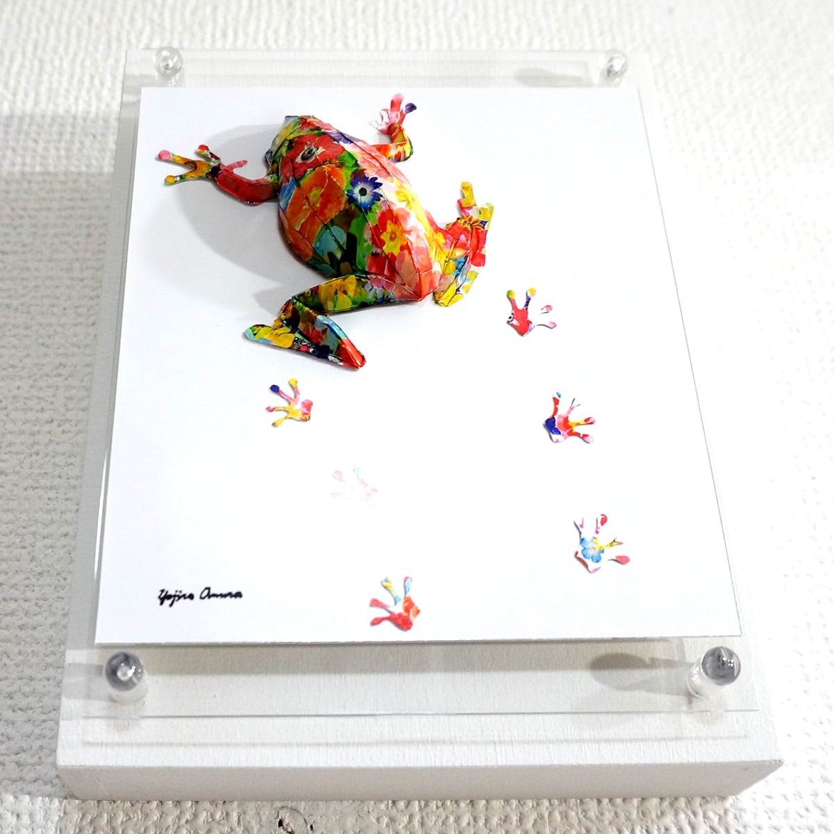 パネルの上をカラフルな花柄のアマガエルがペタペタと花模様の足跡を残しながら歩いている様子を表現いたしました。