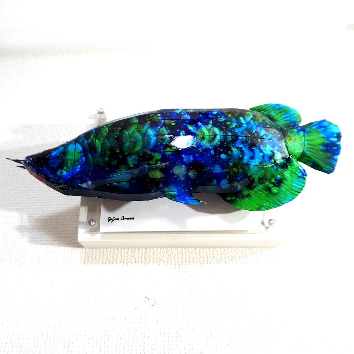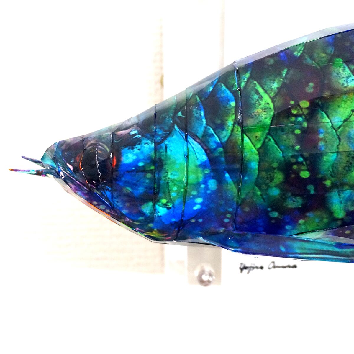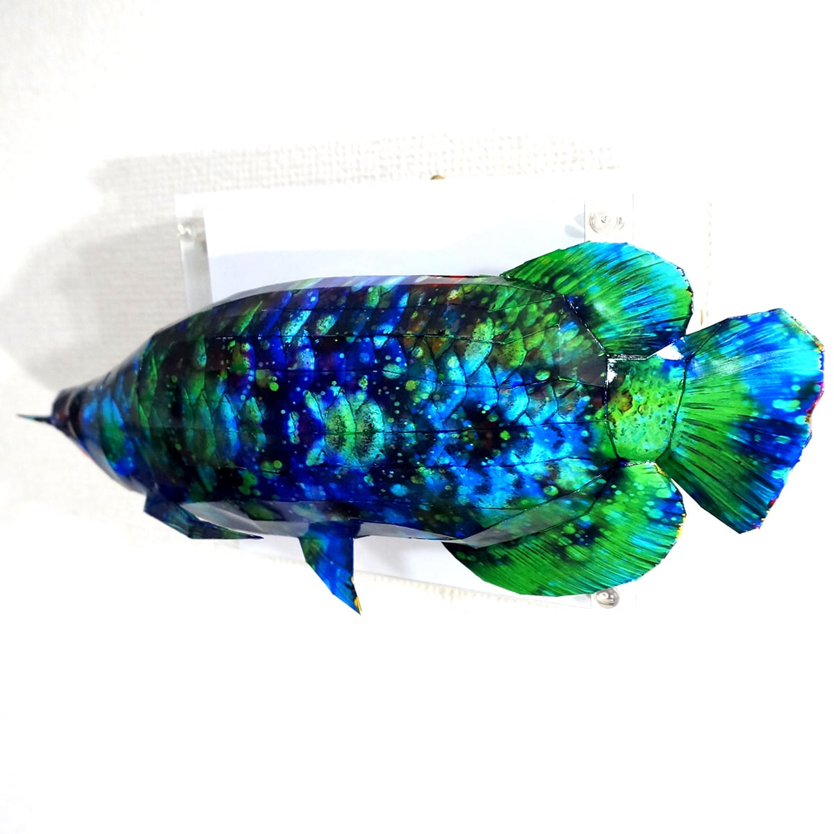 「アロワナのコラージュ画像を作成し、ペーパークラフト技術を用いて立体化した作品です。