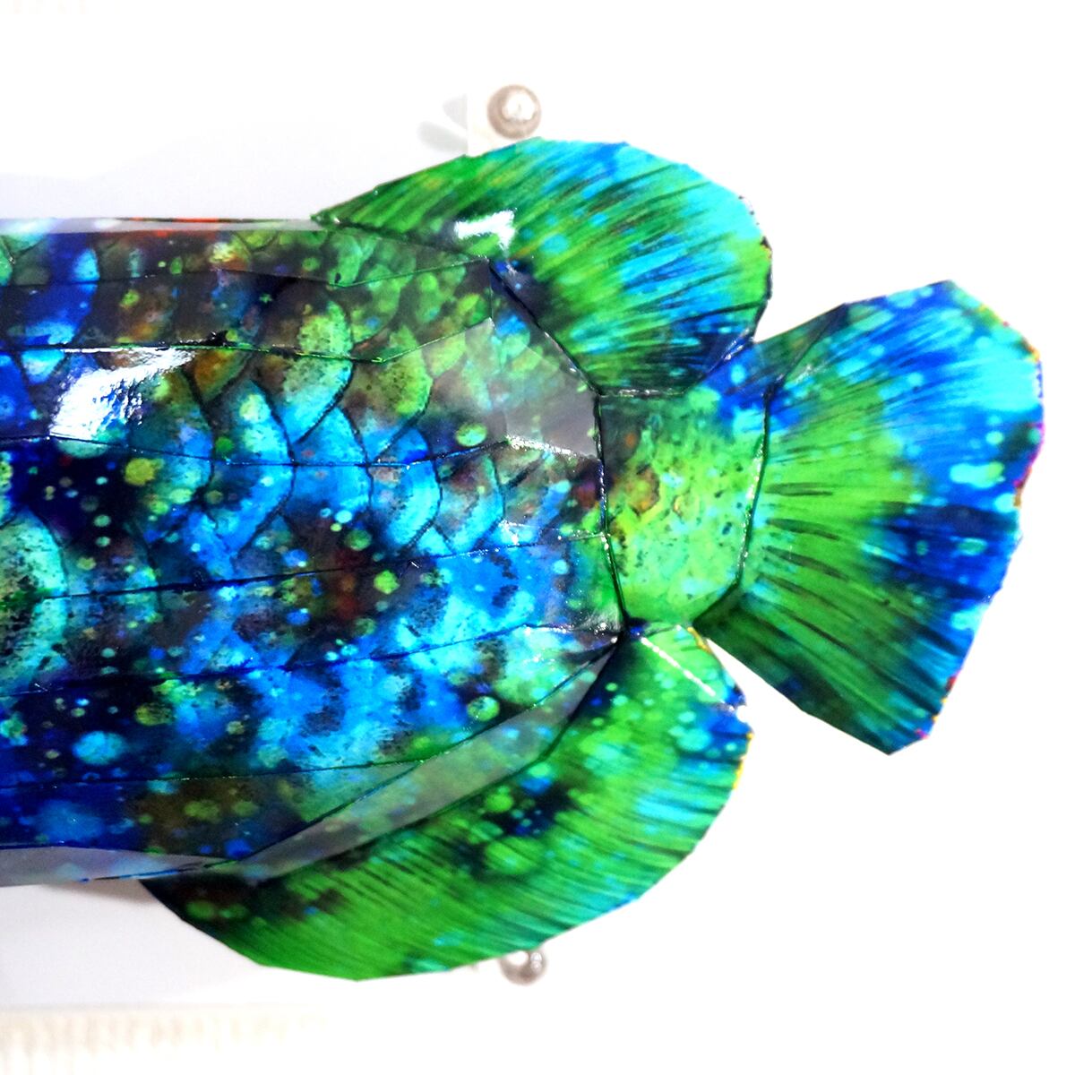 アロワナの丸みのあるどっしりとした造形を多くのパーツを組み合わせることで表現しております。特に細部のディティール(目玉やヒレ部など)は細密に仕上げております。