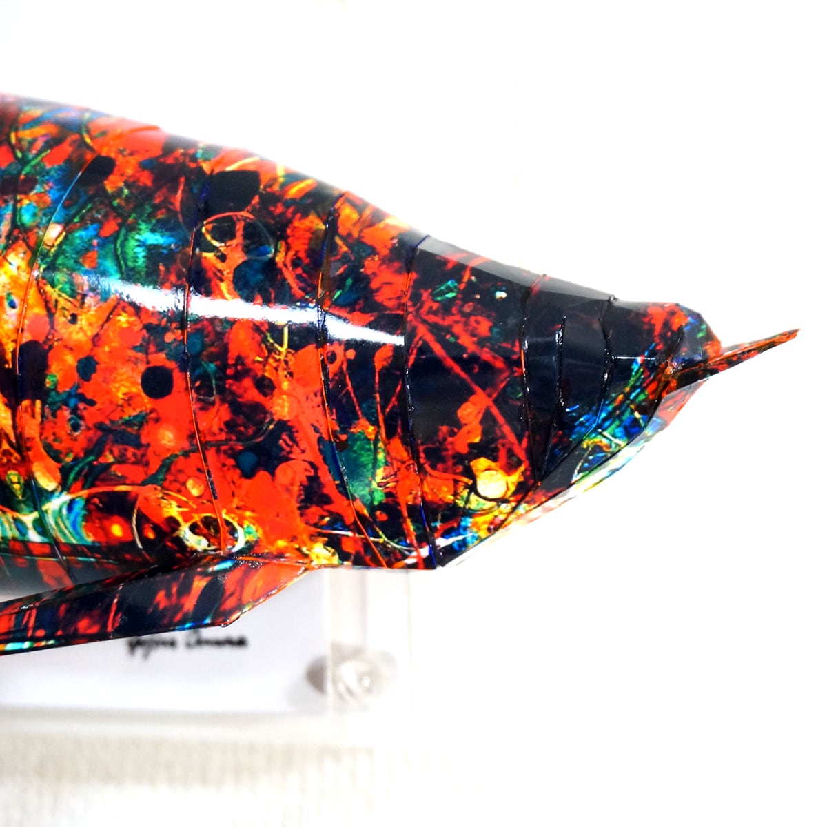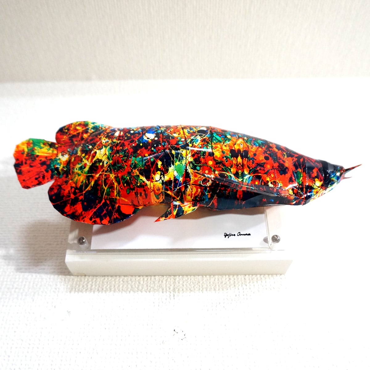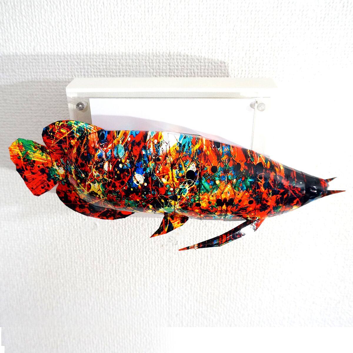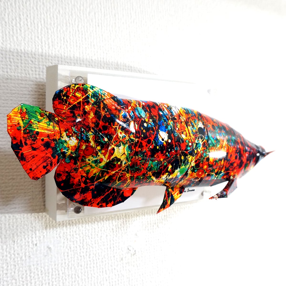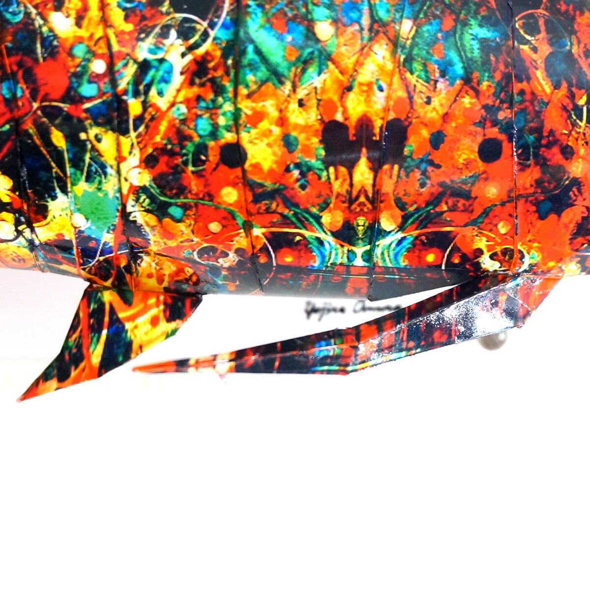 「アロワナのコラージュ画像を作成しペーパークラフト技術を用いて立体化した作品です。