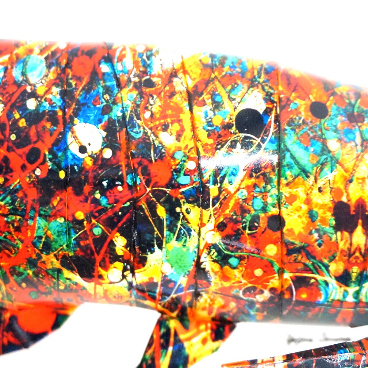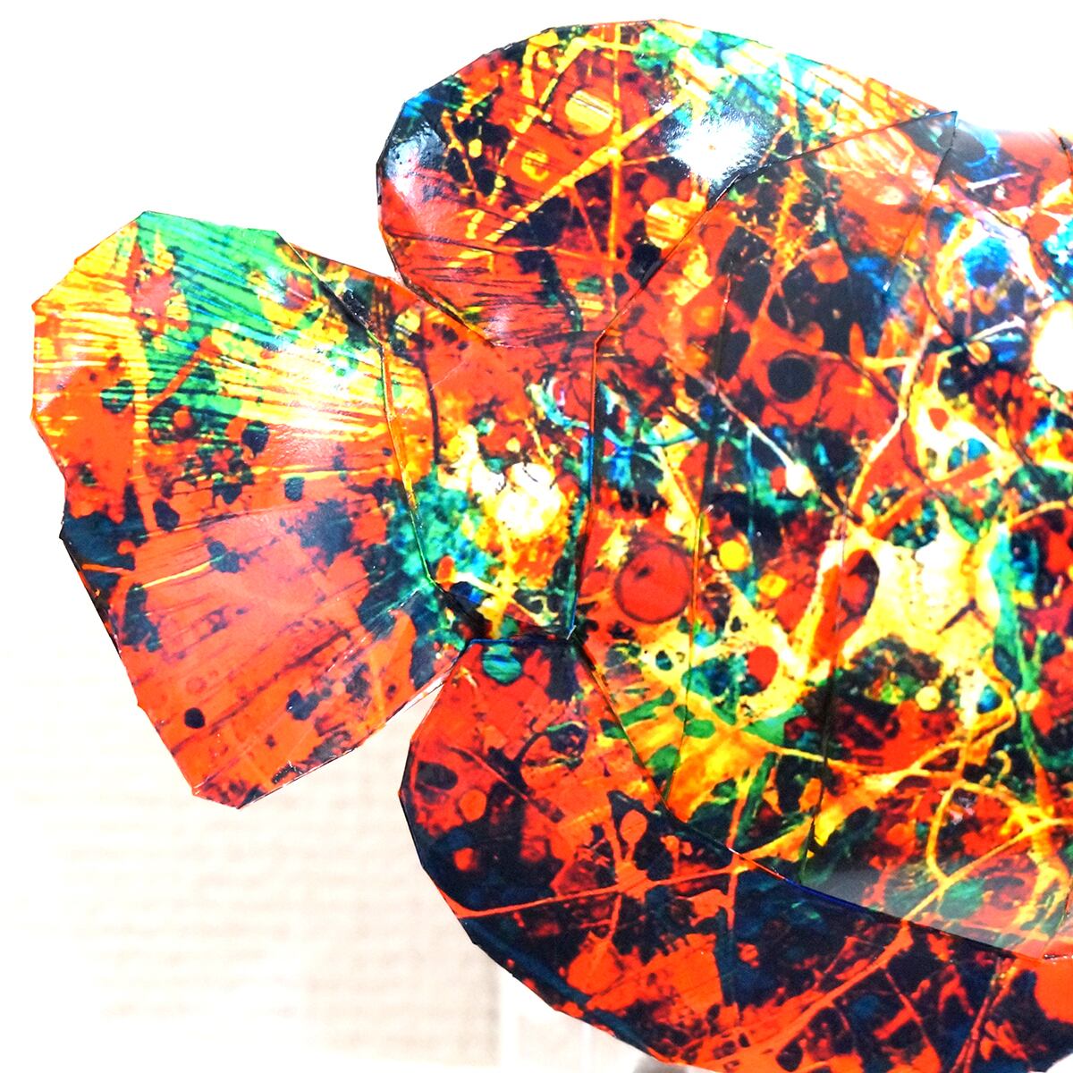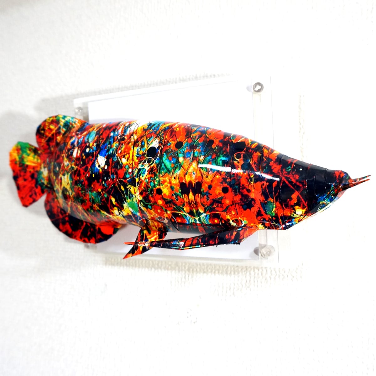 アロワナ本来の表情にカラフルな抽象模様を薄く重ね合わせたデザインです。表面上は光沢紙の艶のある質感となっております。