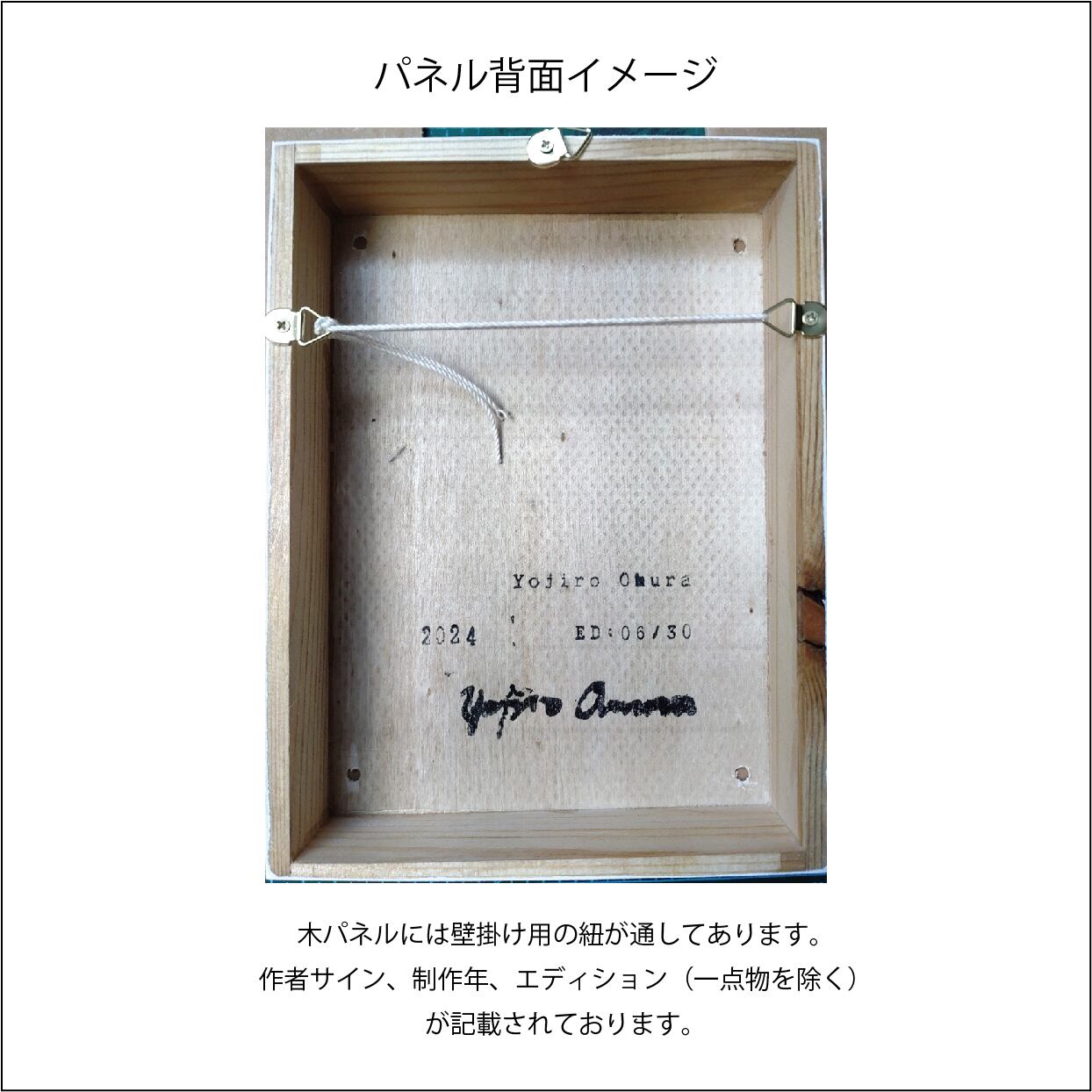 裏面にひも掛け用のフックを取り付け、制作年、作者サインを記載しております。