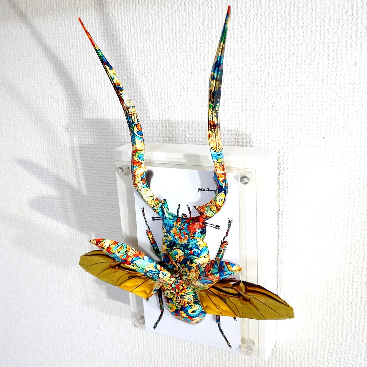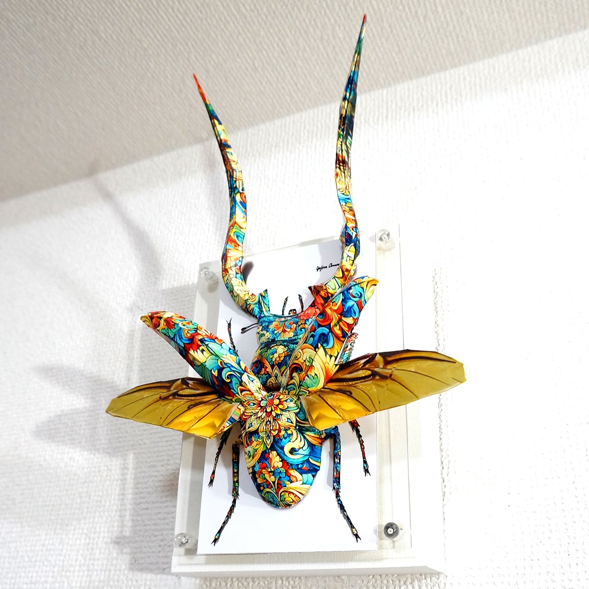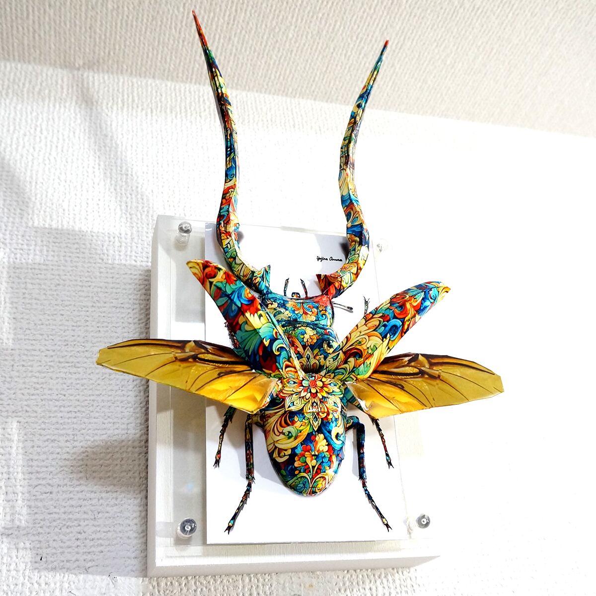 角と羽が大幅にパネルからはみ出した、横にも縦にも大きい迫力の作品に仕上がっております。」