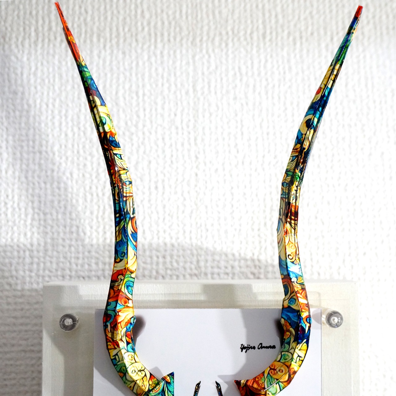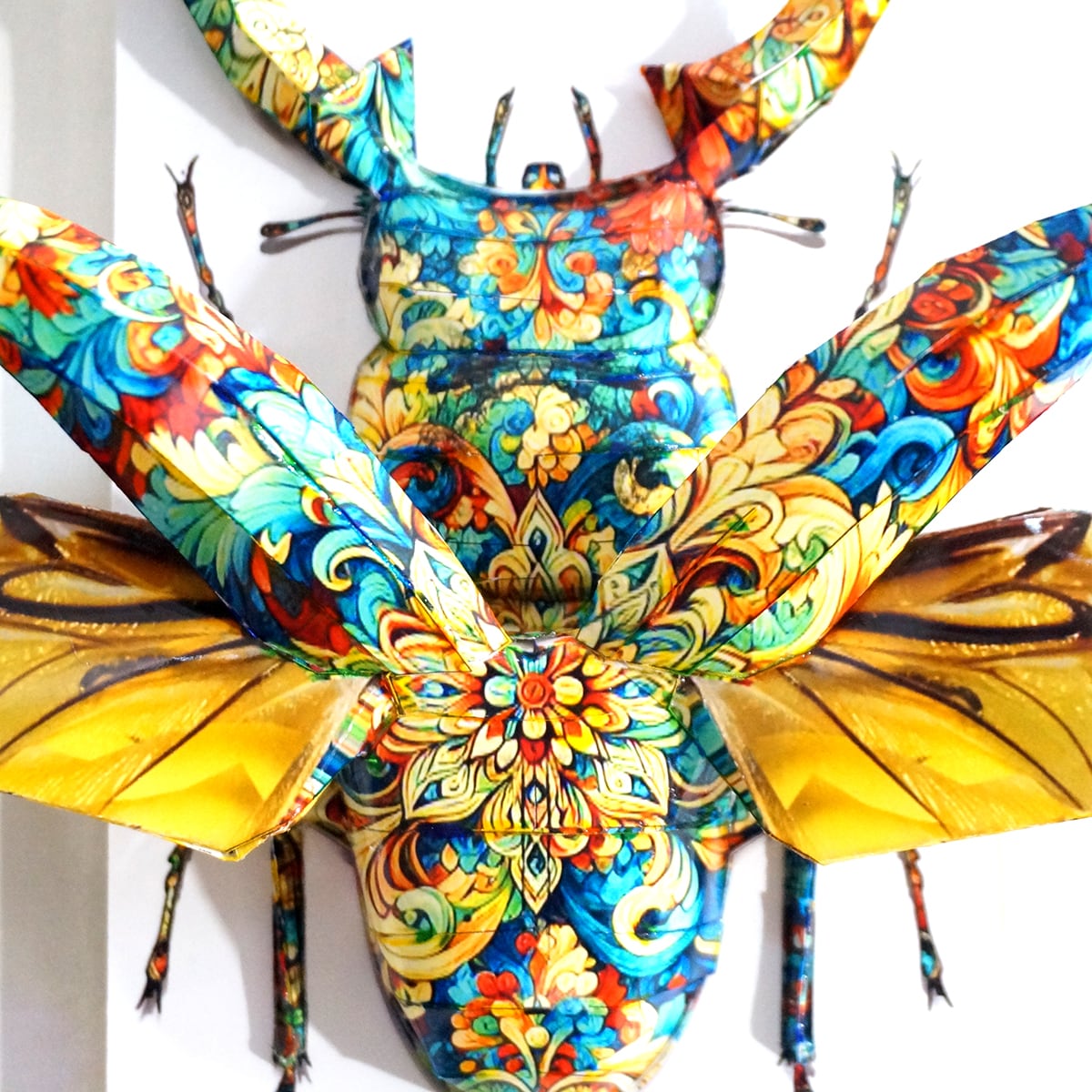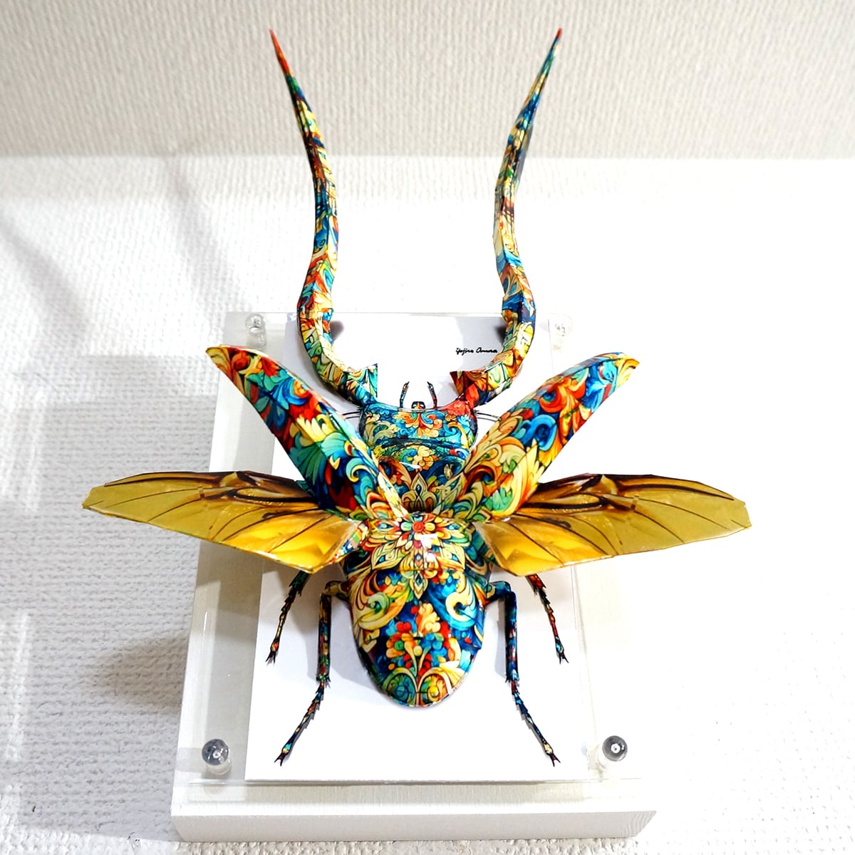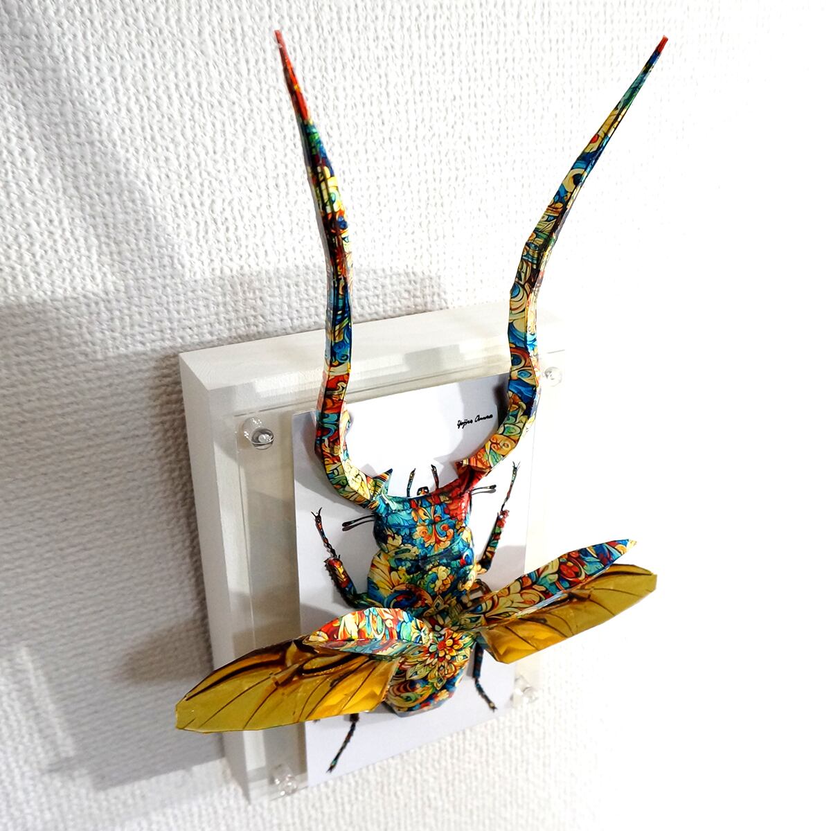 角と羽が大幅にパネルからはみ出した、横にも縦にも大きい迫力の作品に仕上がっております。」