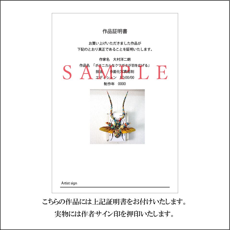 ボタニカルイメージの模様と、クワガタ本来の風合いを重ね合わせたデザインです。表面上は光沢紙の艶のある質感となっております。