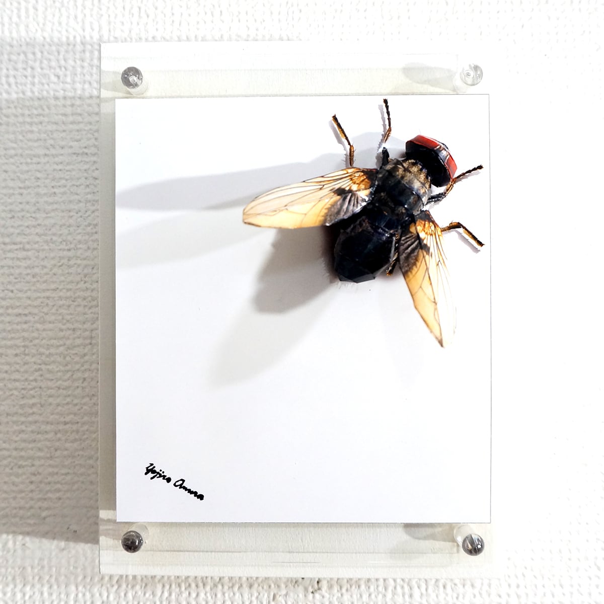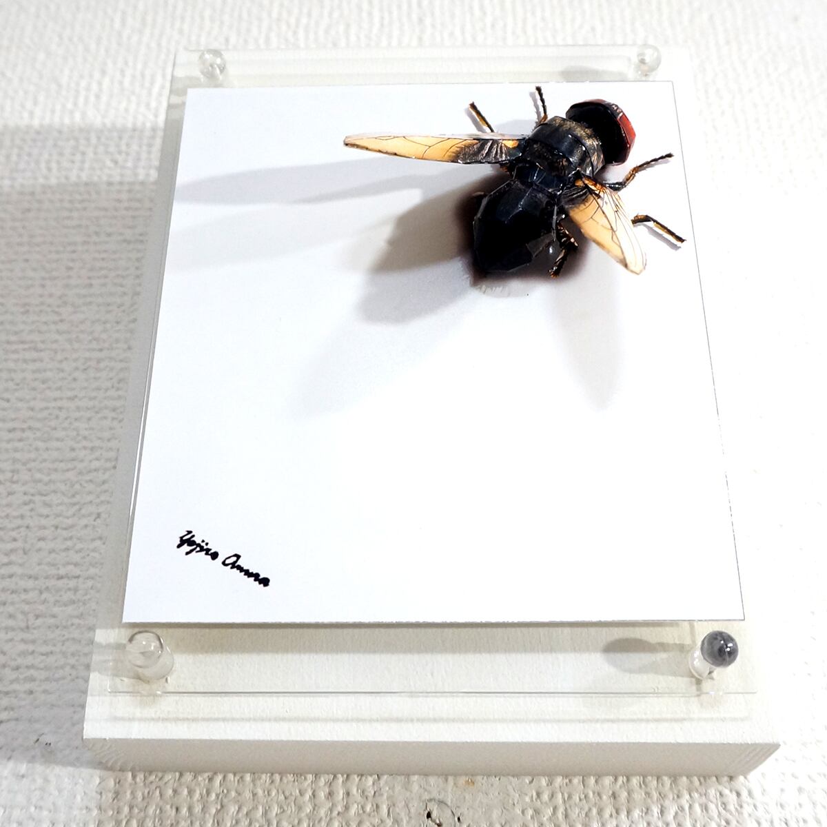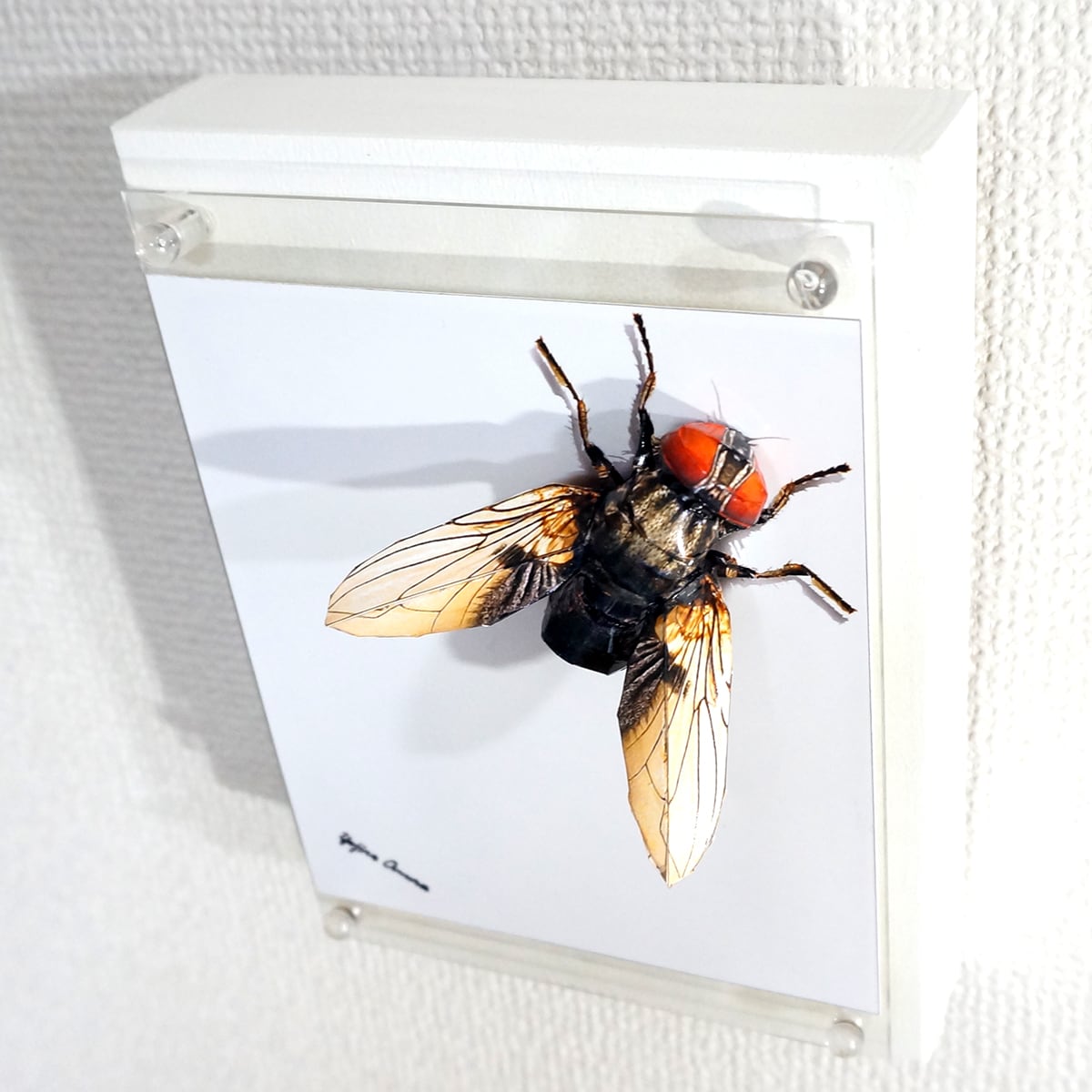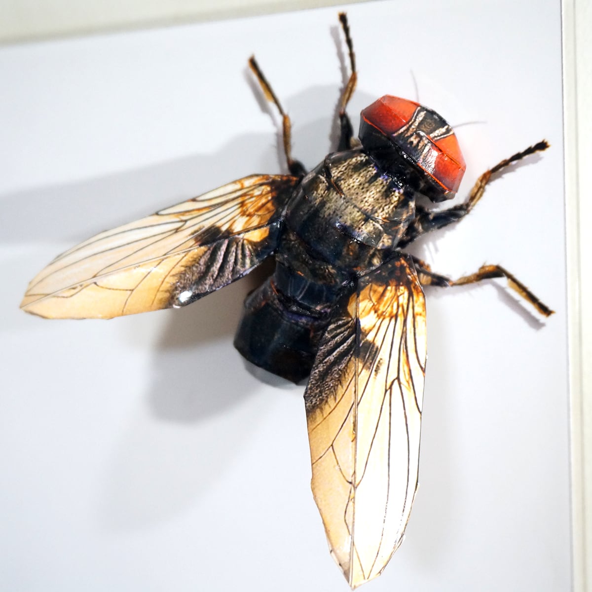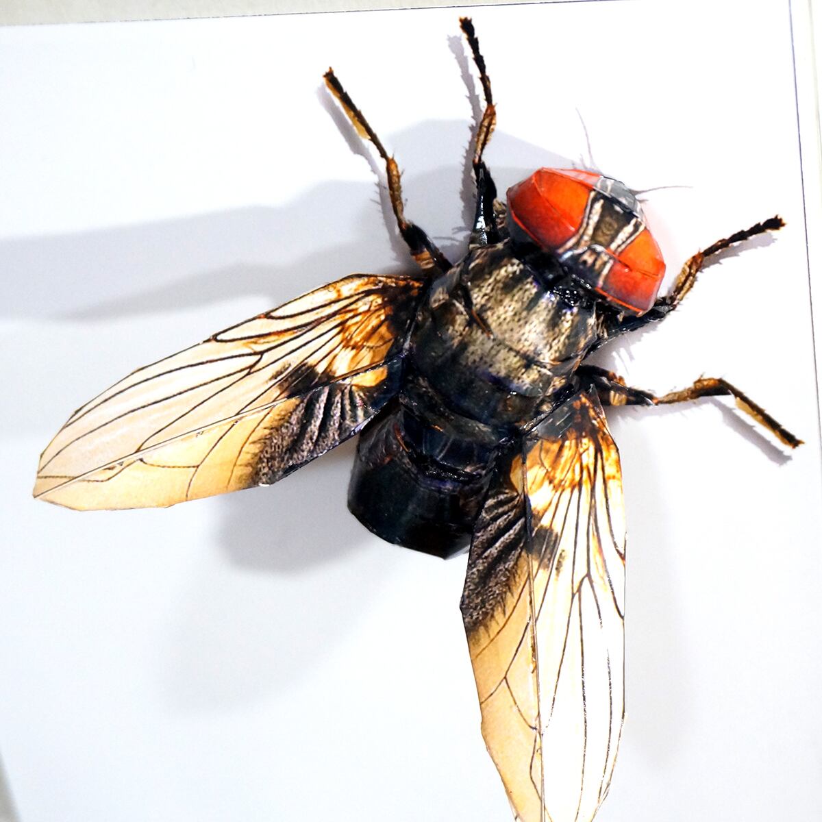 「ハエのコラージュ画像を作成しペーパークラフト技術を用いて立体的に表現した作品です。