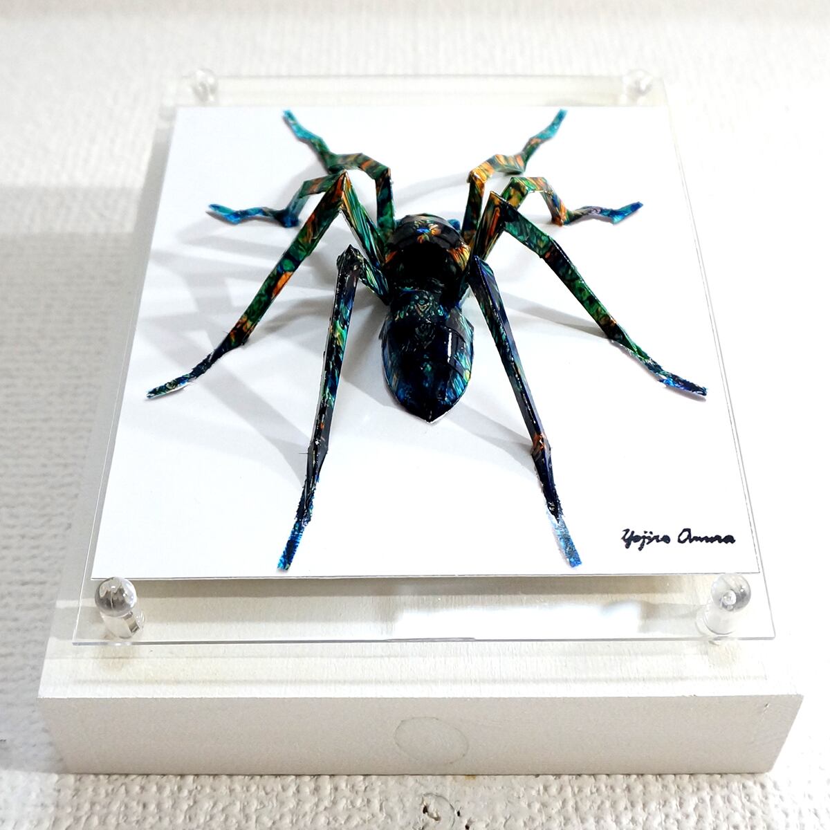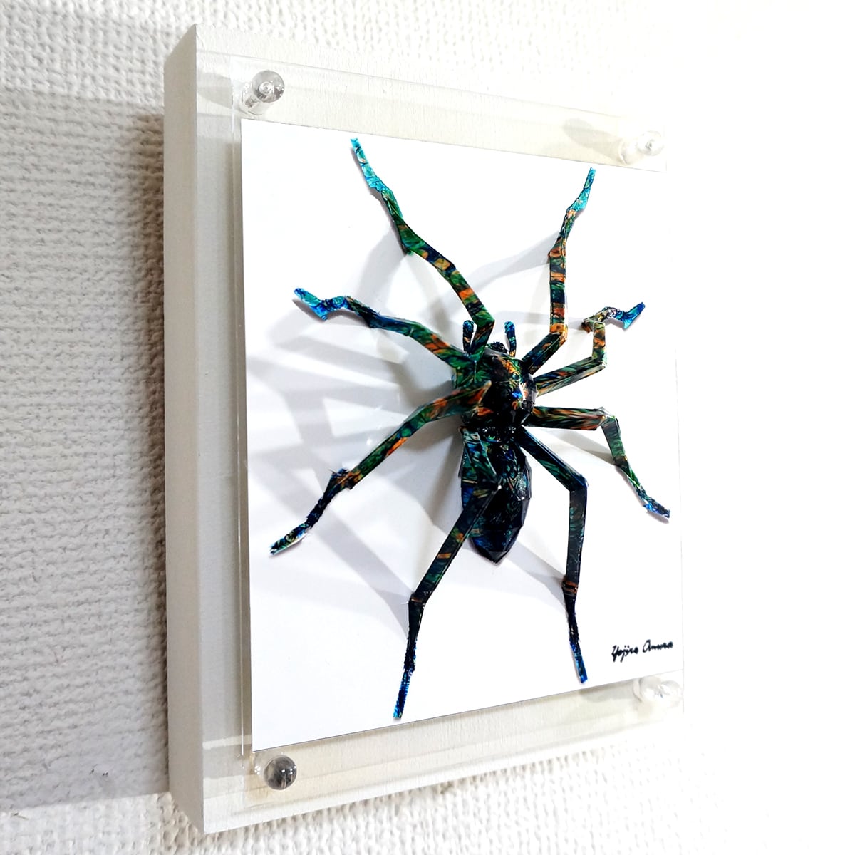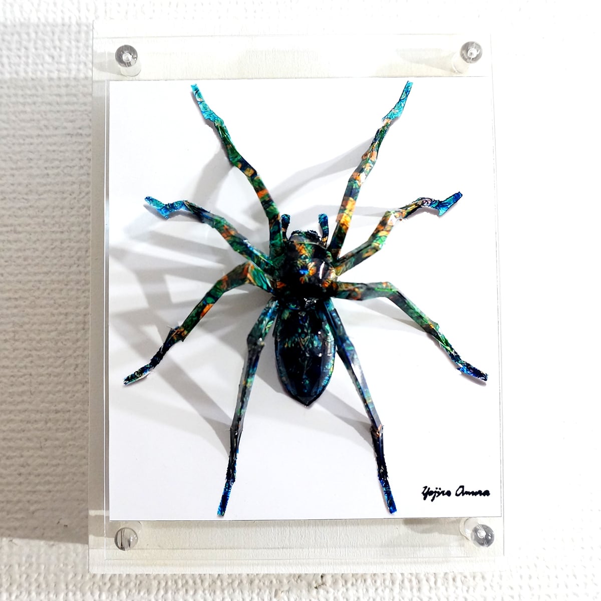 蜘蛛は脚の細さによる強度問題や制作過程の大変さから、これまで避けてきたモチーフなのですが、平面性と立体性を活かした技法を駆使して完成に漕ぎつけました。