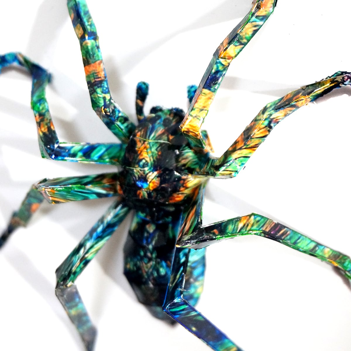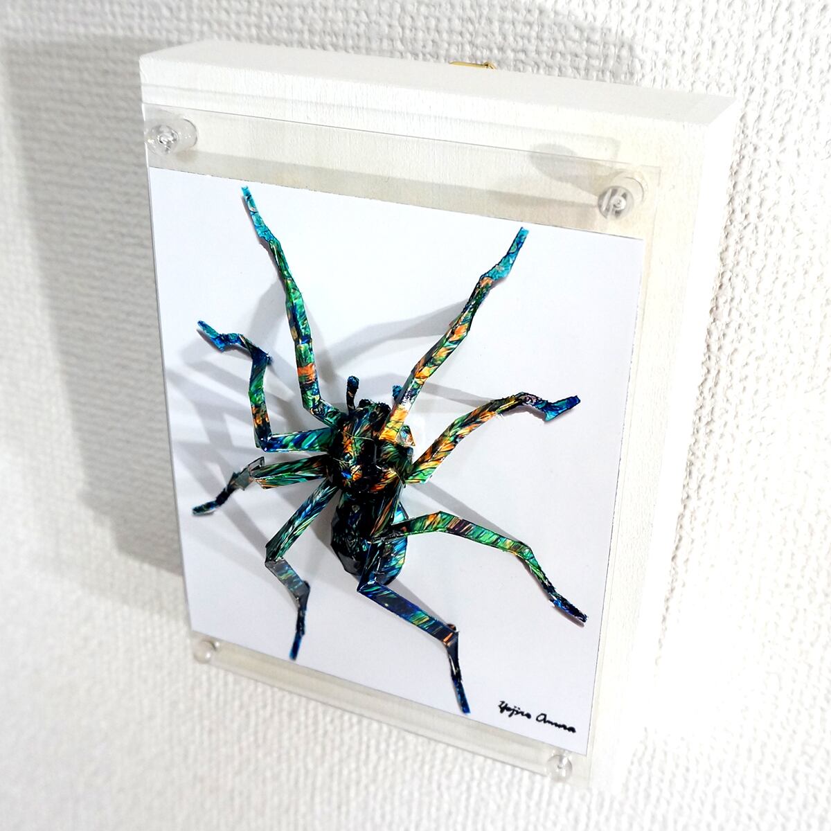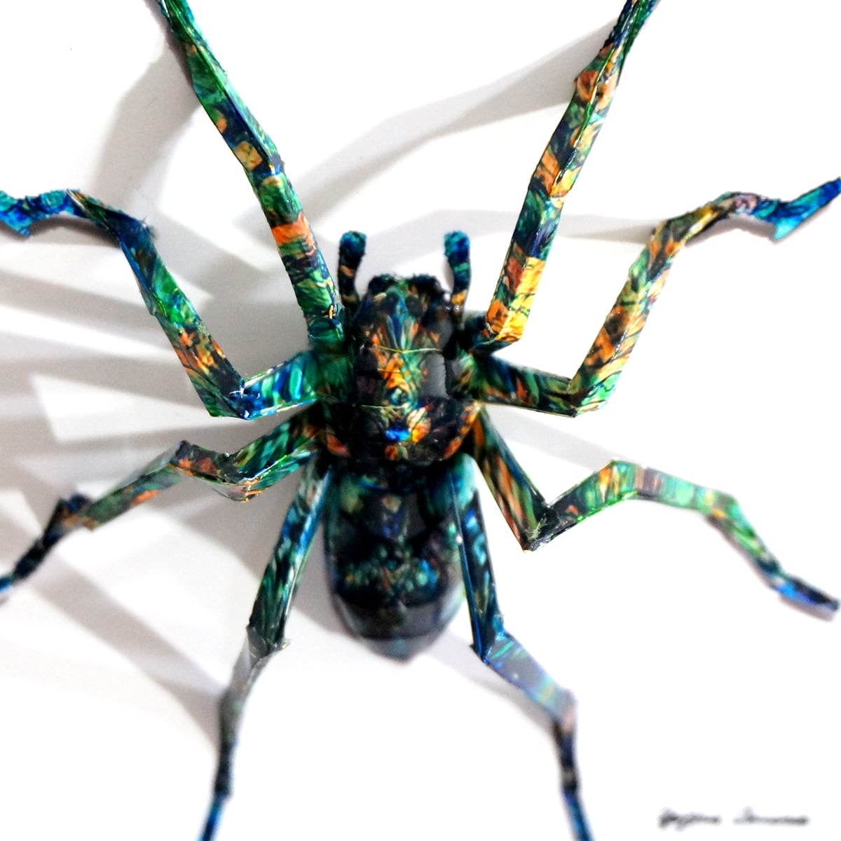 蜘蛛は脚の細さによる強度問題や制作過程の大変さから、これまで避けてきたモチーフなのですが、平面性と立体性を活かした技法を駆使して完成に漕ぎつけました。