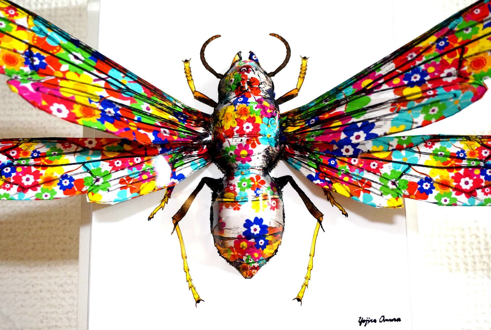 複数のスズメバチのパーツを組み合わせたコラージュ画像を作成し、花柄のペイントテクスチャを表面に施したデザインです。