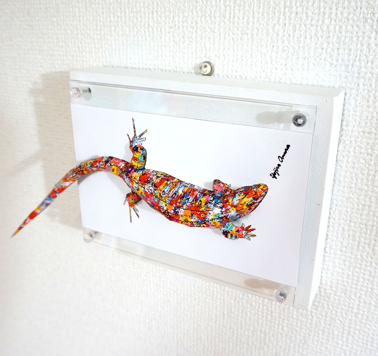 作者サインや影部分などは平面で残しトカゲの本体を立体化することで、より奥行きを感じられる仕組みとなっています。