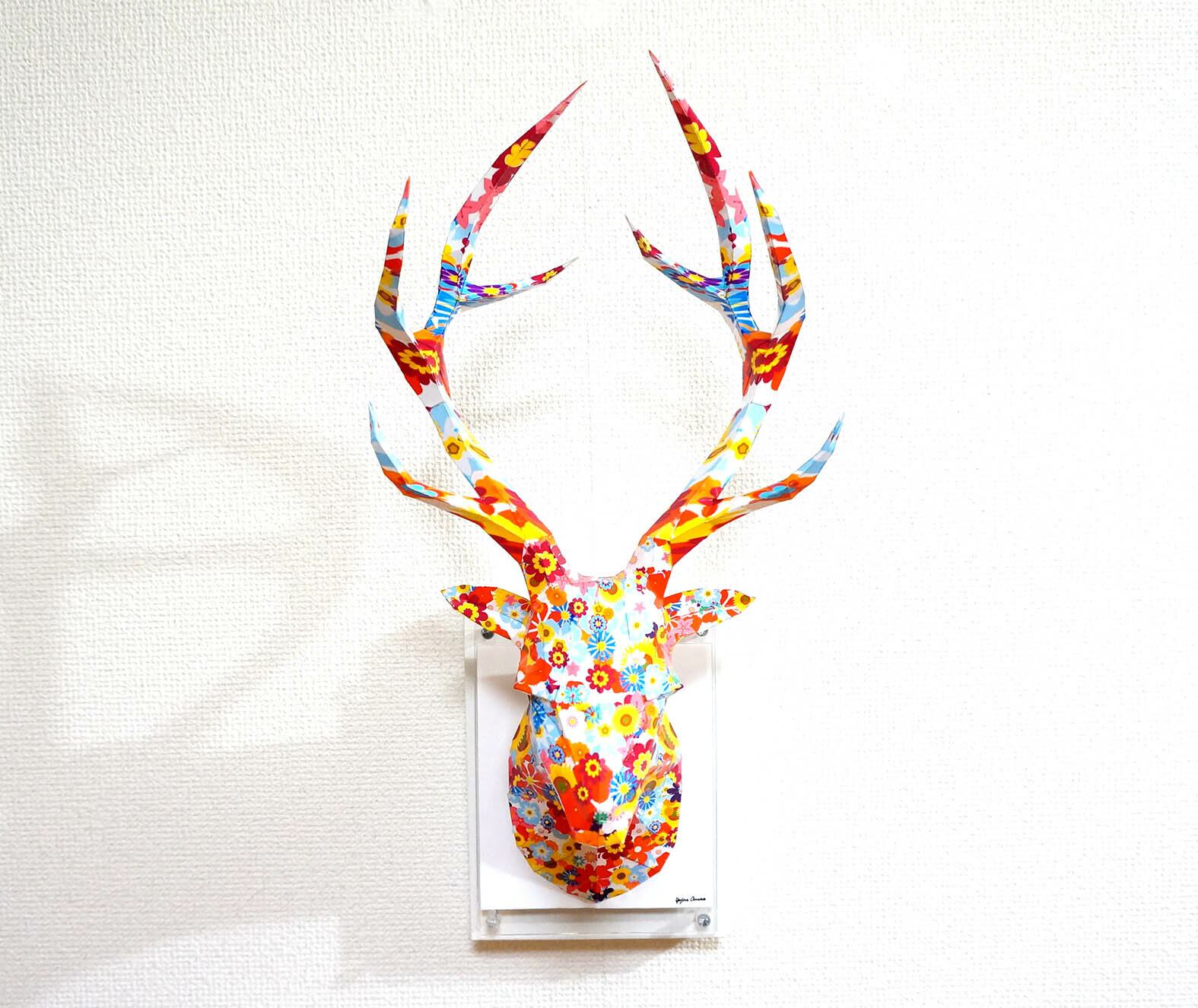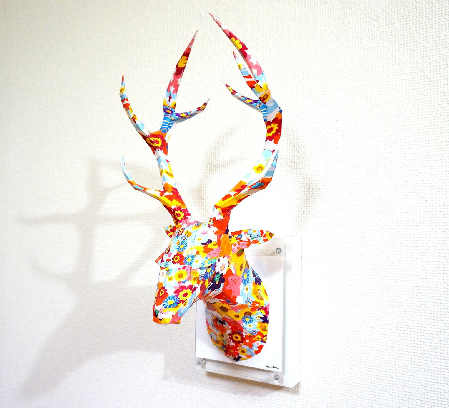 カラフルな花柄模様をテクスチャとして施したデザインとなっております。以前にも花柄のハンティングトロフィーは制作いたしましたが、この度新たによりカラフルでポップなイラストに変更しております。