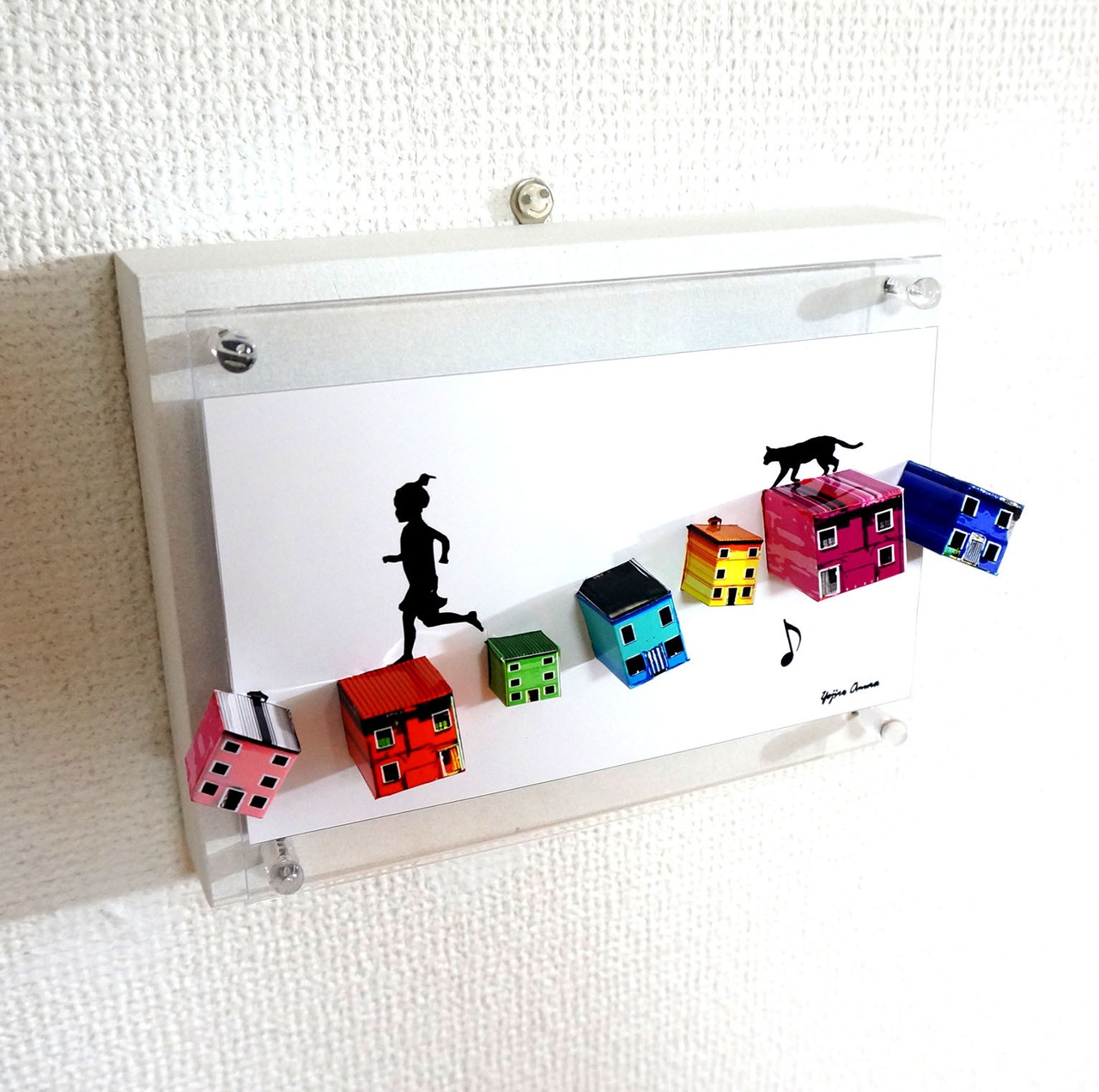 両サイドの家の端をパネルからはみ出させることで、二人がそのままパネルの外まで駆け抜けていきそうな予感を感じさせるデザインになっております。