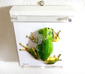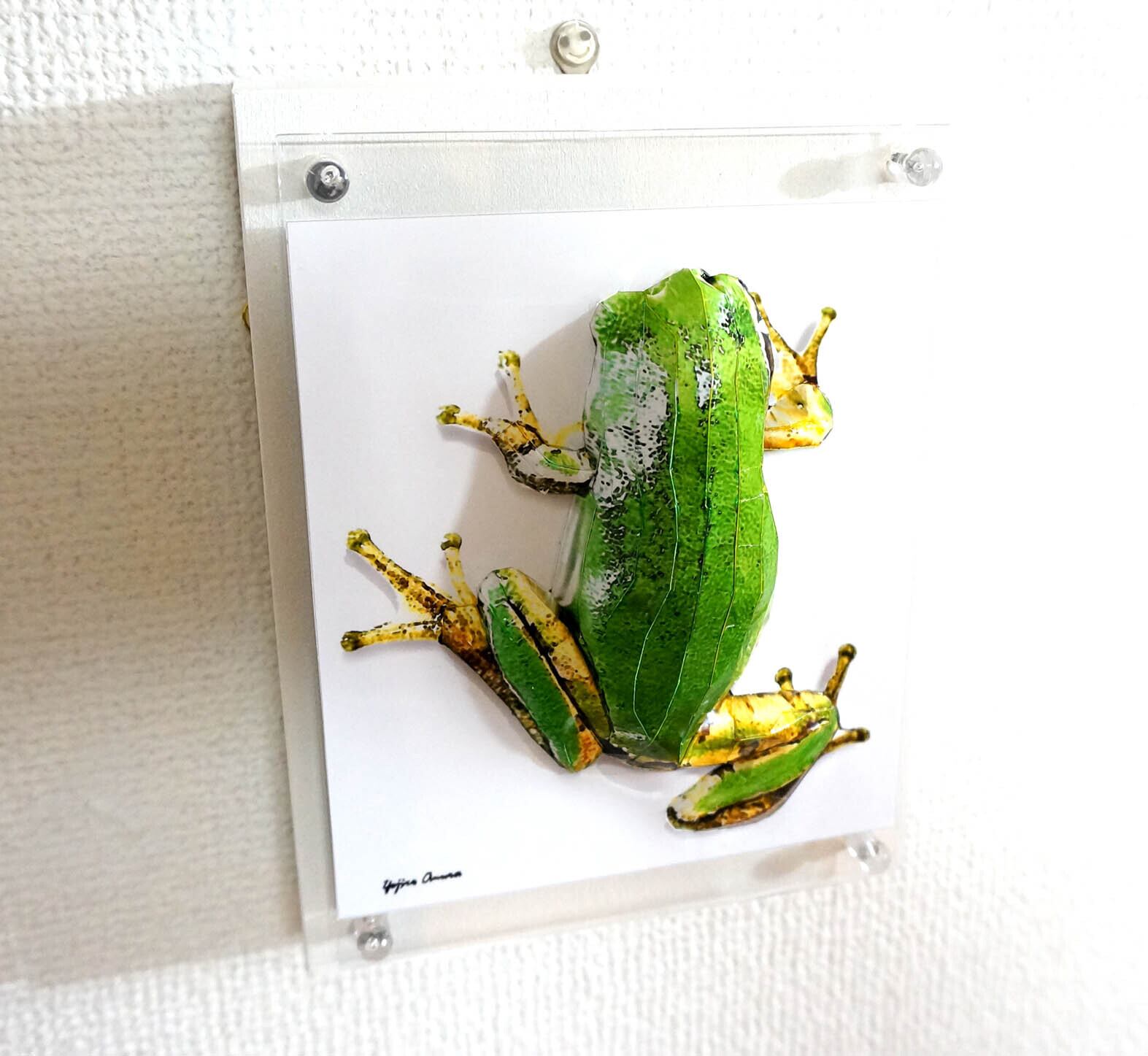「こちらはアマガエルが壁に張り付いている様子をペーパークラフトで立体的に表現した作品になります。