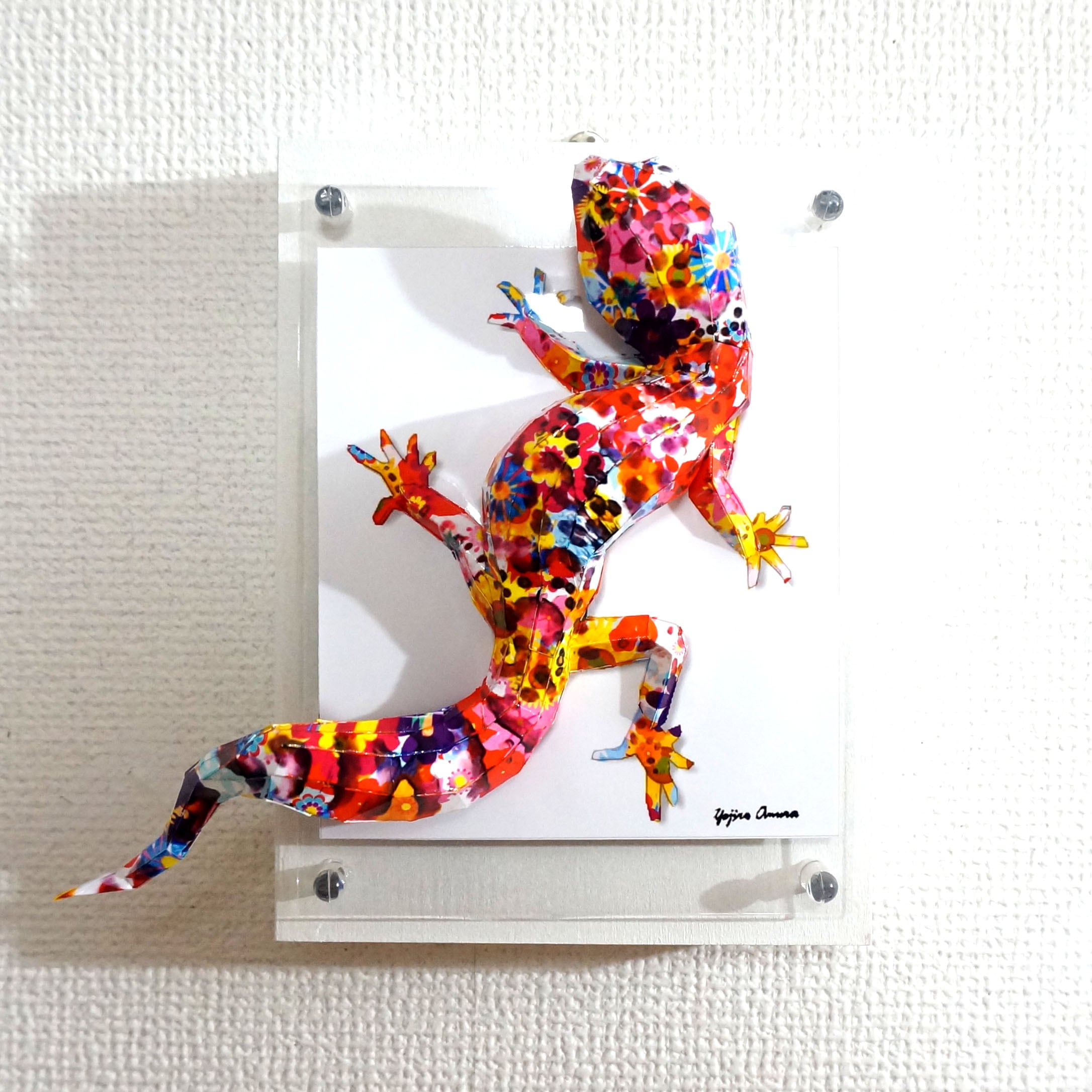 表面上にはカラフルな花柄模様をトカゲ本来の模様に重ね合わせて表現いたしました。