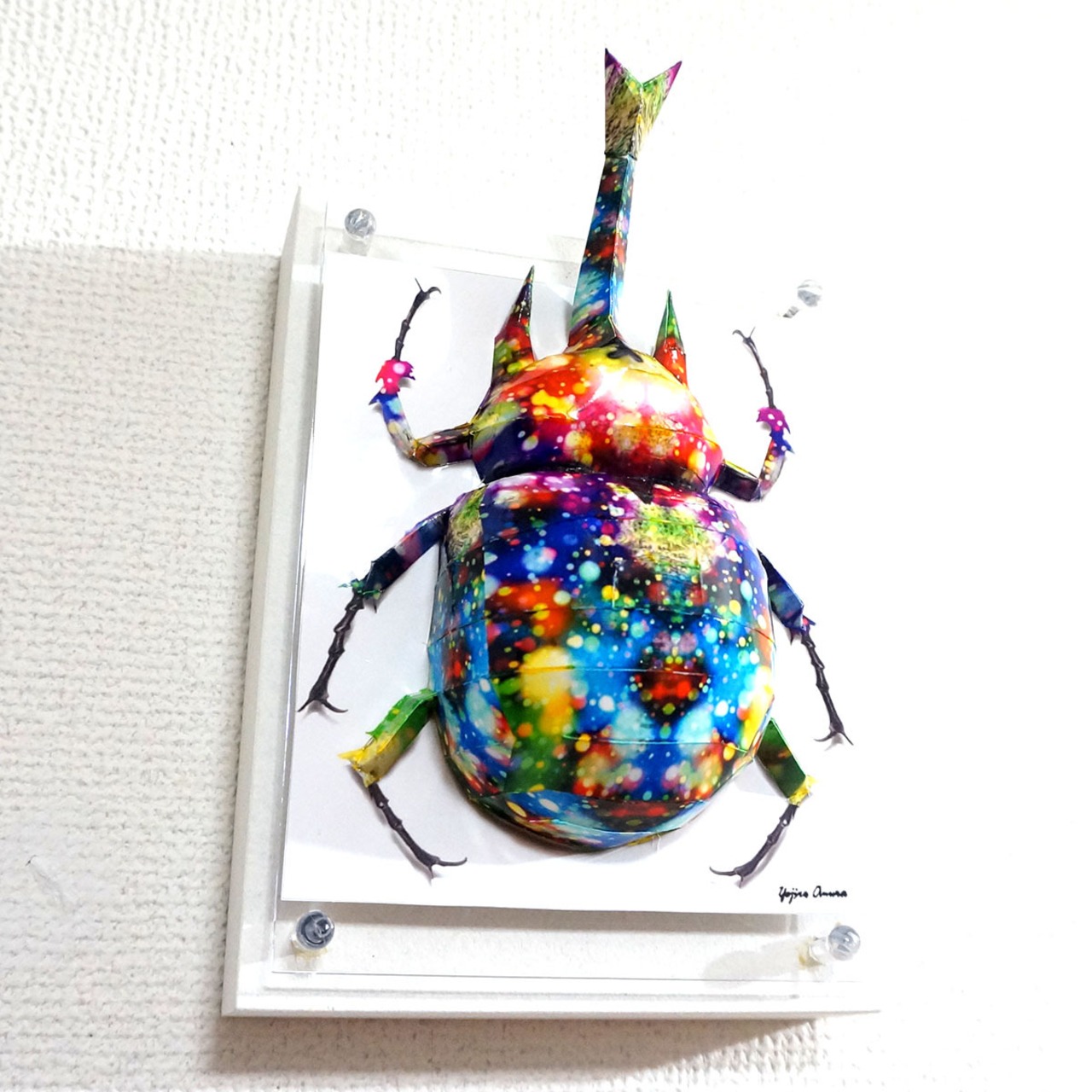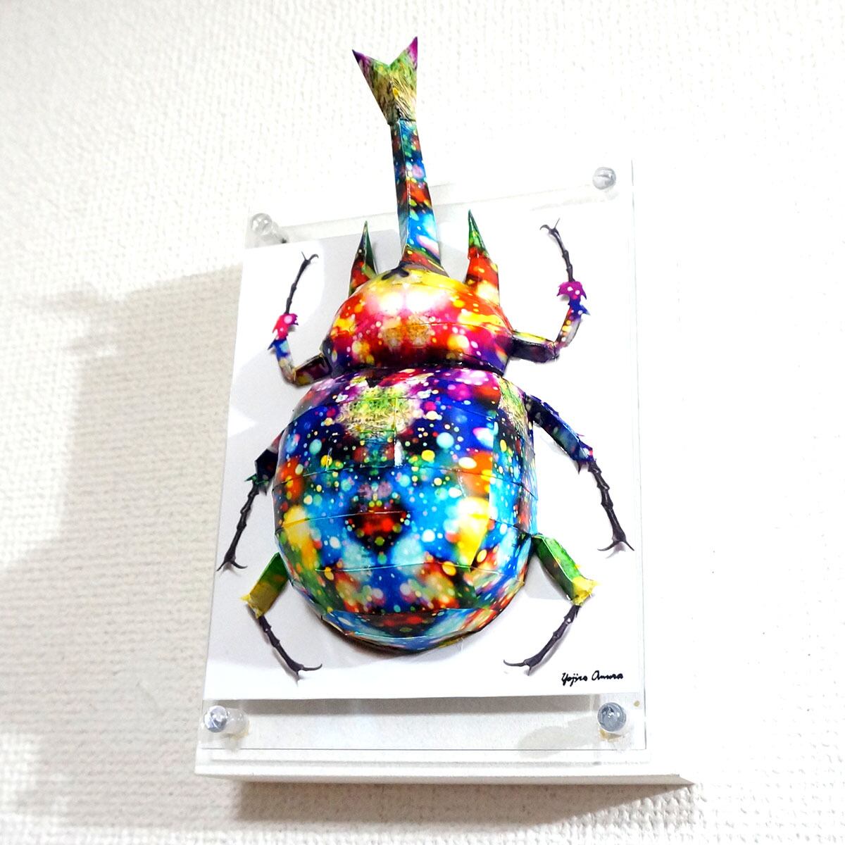 「こちらはペーパークラフト技術を用いゾウカブトムシを立体的に表現した作品です。