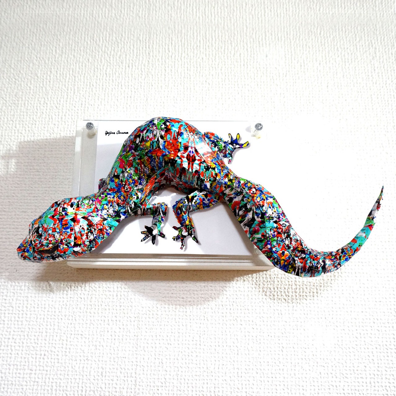 大きな体がパネルからはみ出す非常に迫力のある作品です。カラフルなペイントから独特の危うさを感じさせるインパクトの強い一品となっております。」