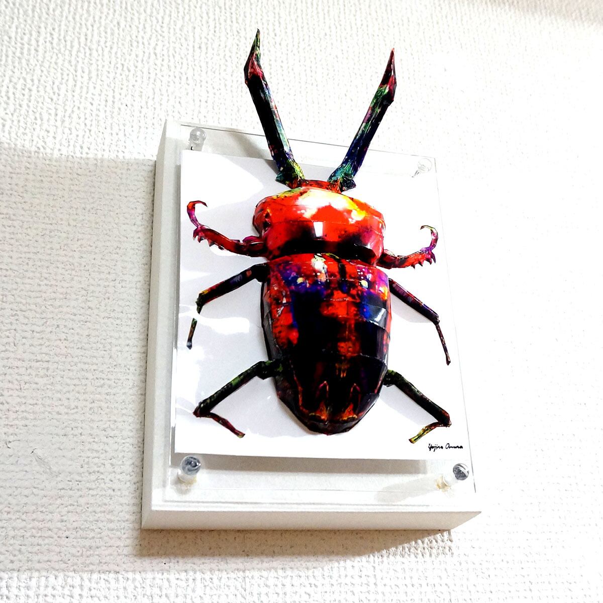 「こちらはペーパークラフト技術を用いニジイロクワガタを立体的に表現した多面化写真彫刻作品です。