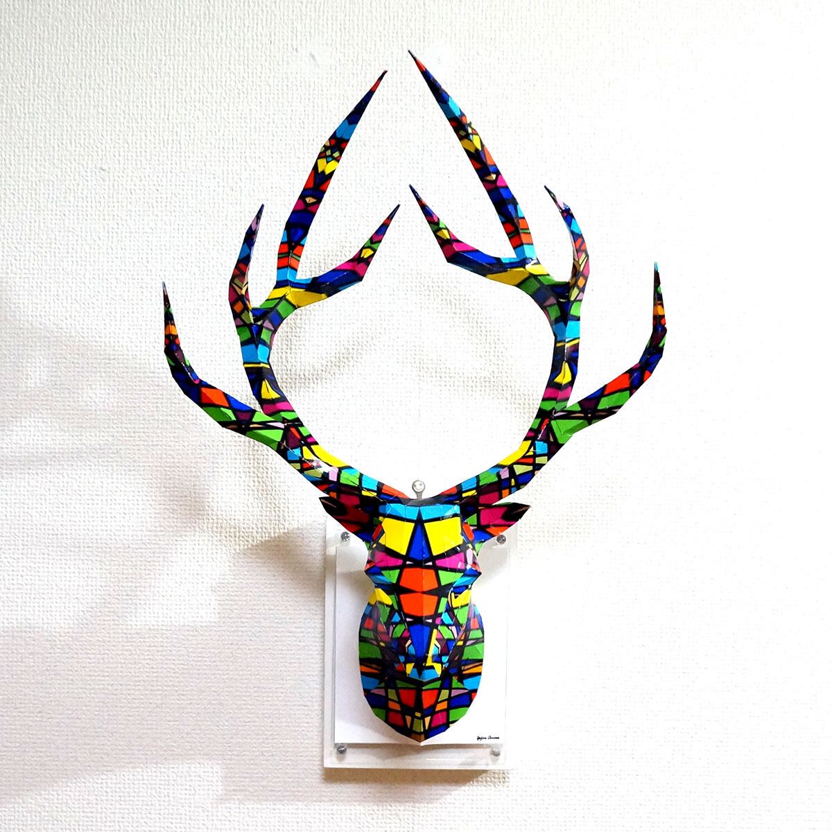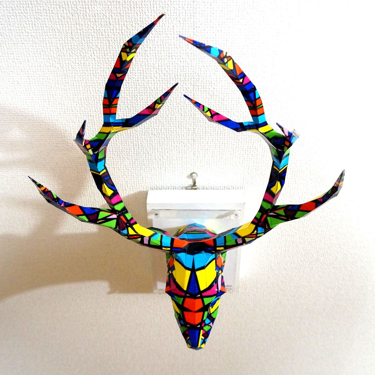 「ペーパークラフト技術を用いて制作した鹿のハンティングトロフィーの多面化写真彫刻作品になります。