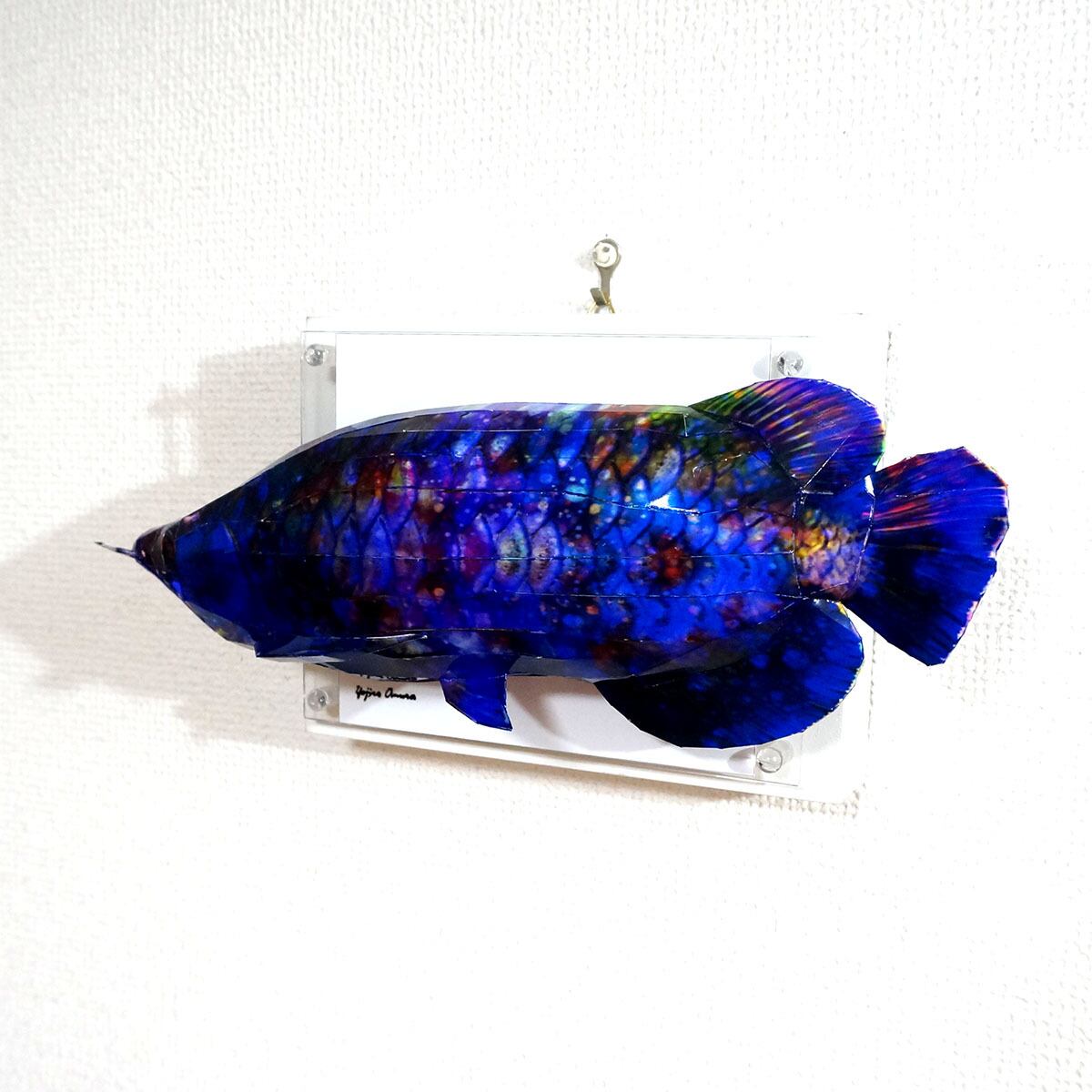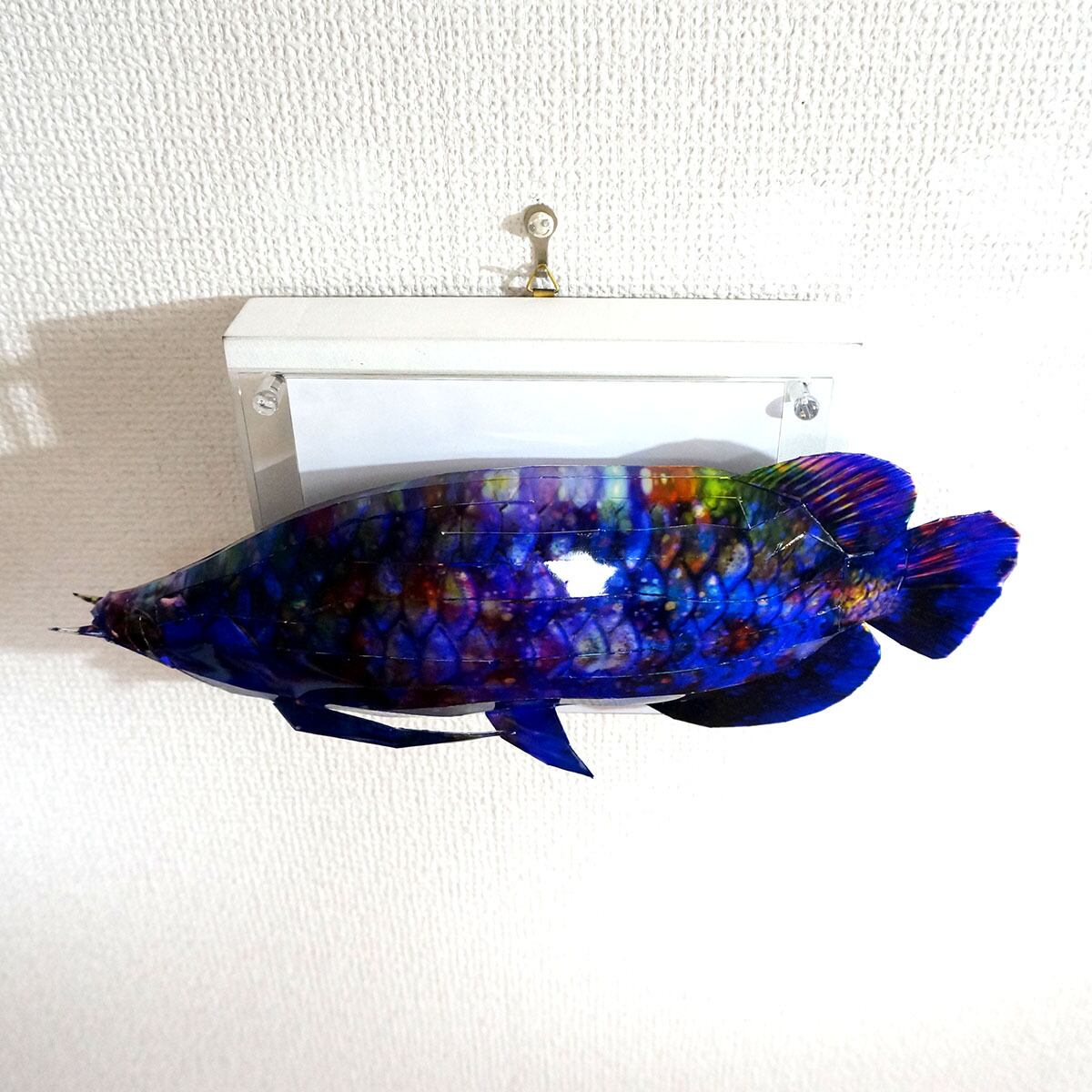 表面上はアロワナ本来の表情に深いブルーカラーを基調としたペイントを重ね合わせて構成いたしました。