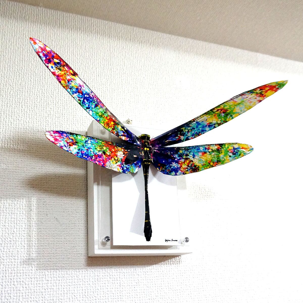 「こちらはトンボの画像を元にペーパークラフト技術を用いて立体的に表現した多面化写真彫刻作品になります。