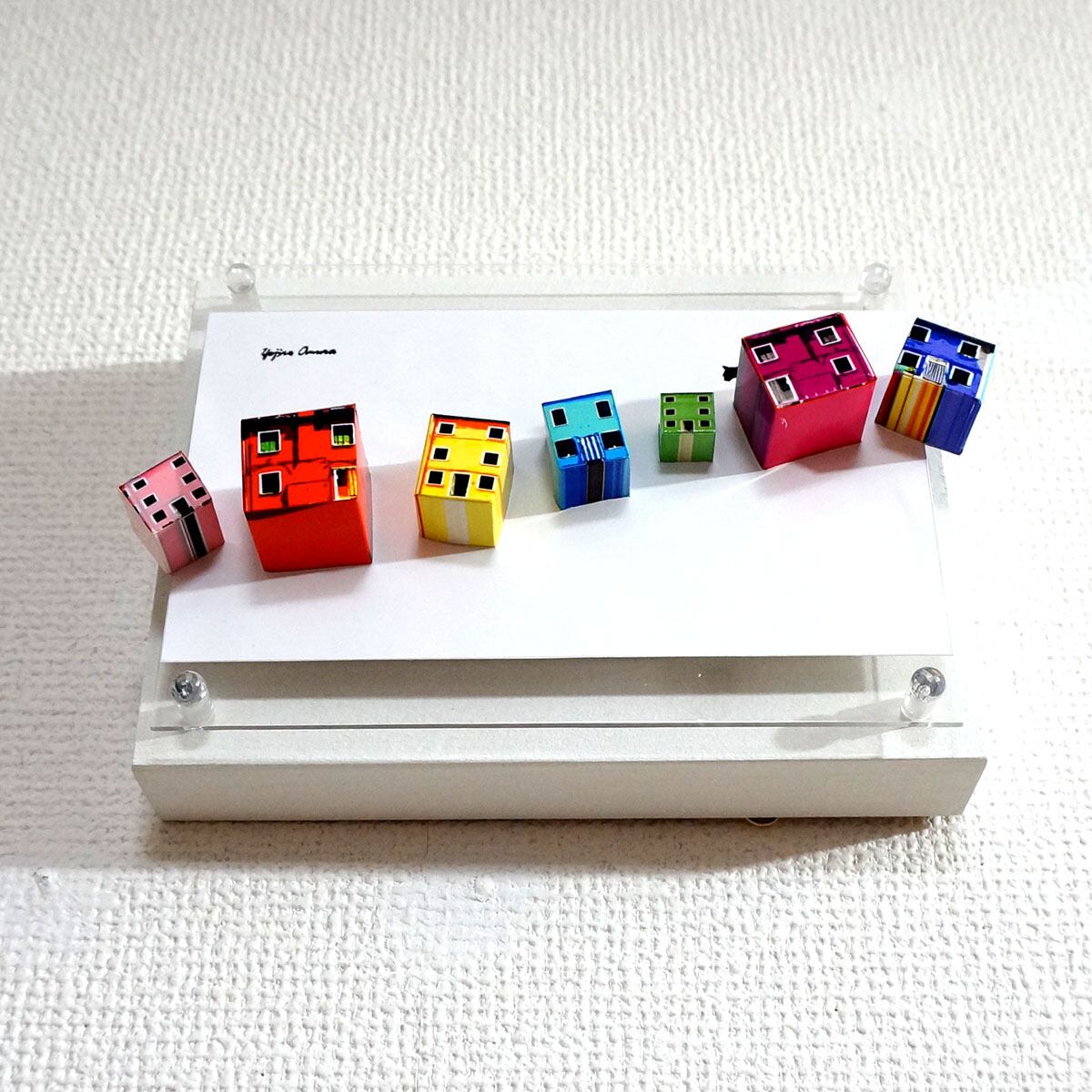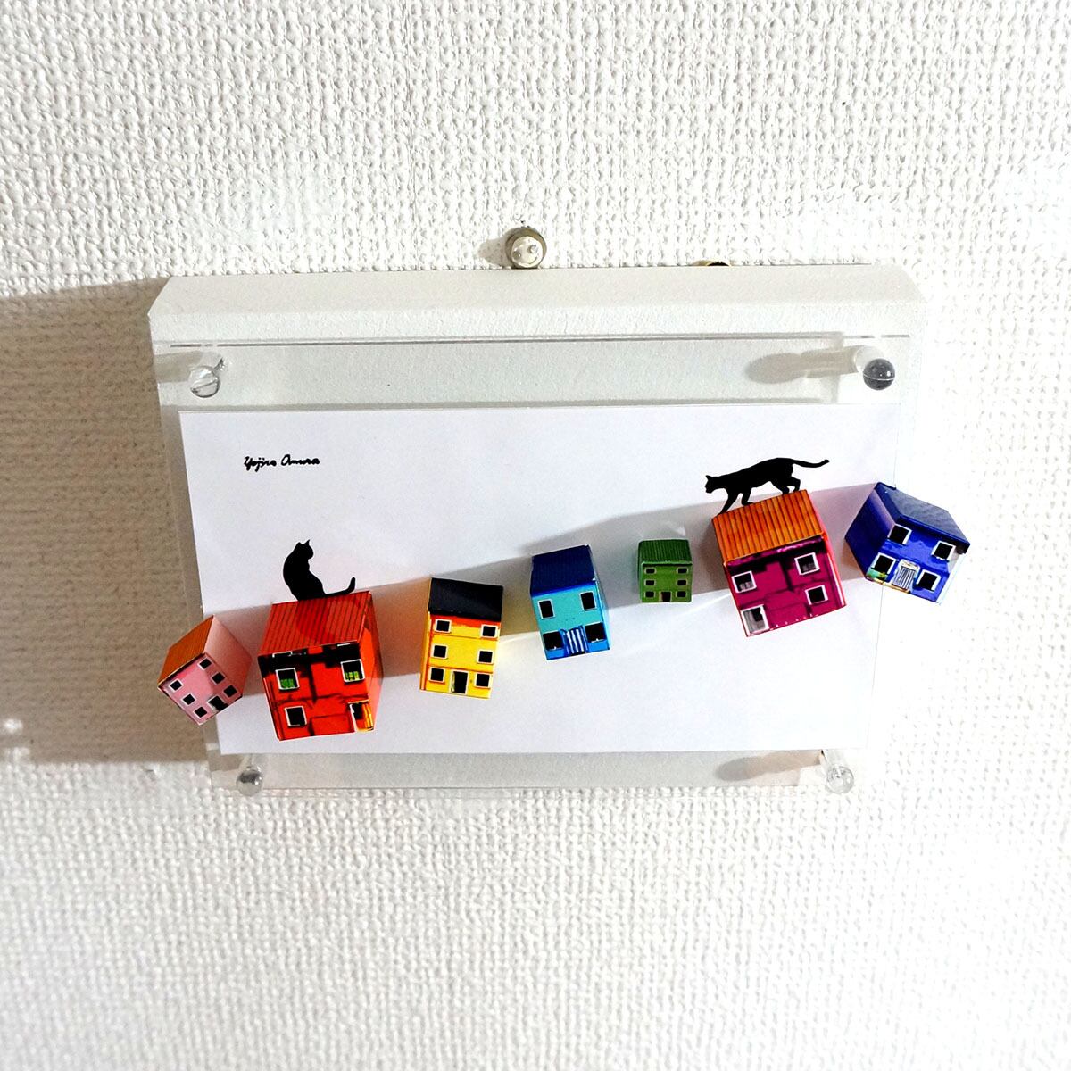 「こちらは二匹の猫が空に浮かんだ家の上で待ち合わせをしている様子をペーパークラフト技術を用いて表した多面化写真彫刻作品になります。