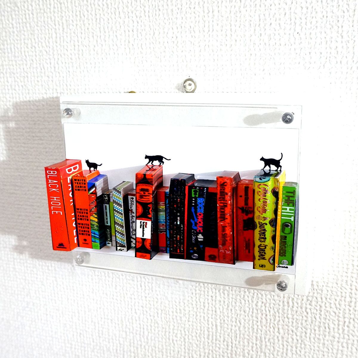 「こちらは3匹の猫が並べられた本の上を散歩する様子を表した多面化写真彫刻作品になります。