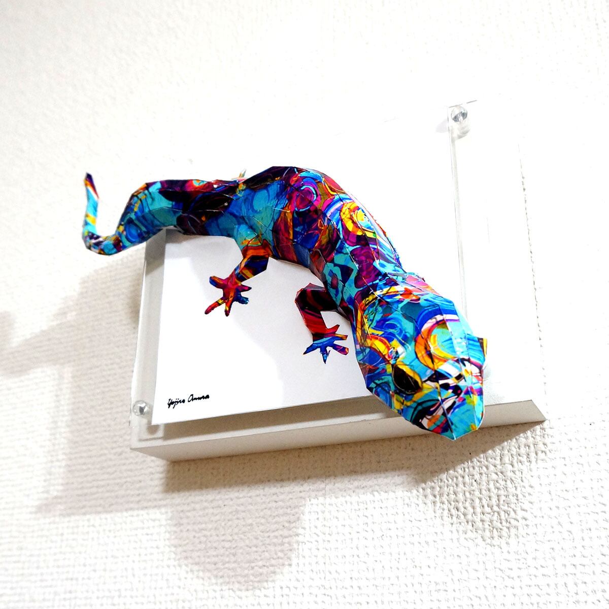 「こちらは写真を元にトカゲをペーパークラフト技術を用いて立体化した多面化写真彫刻作品です。