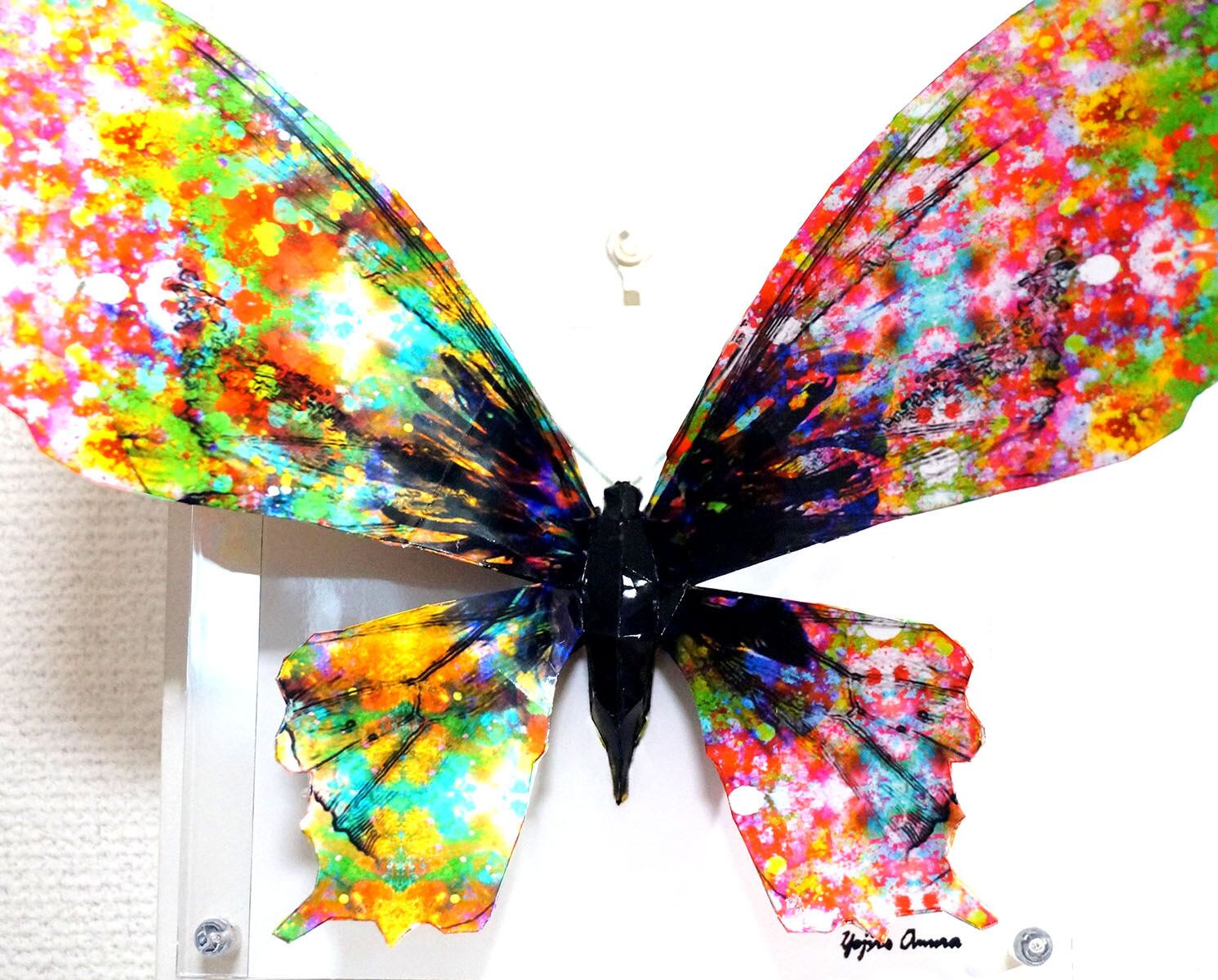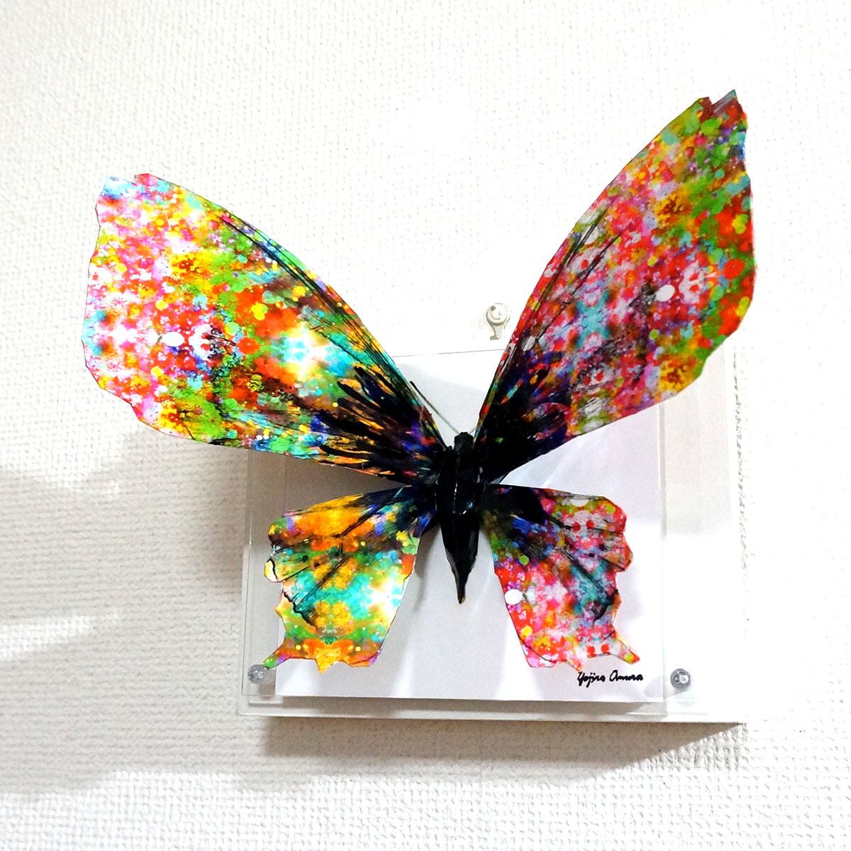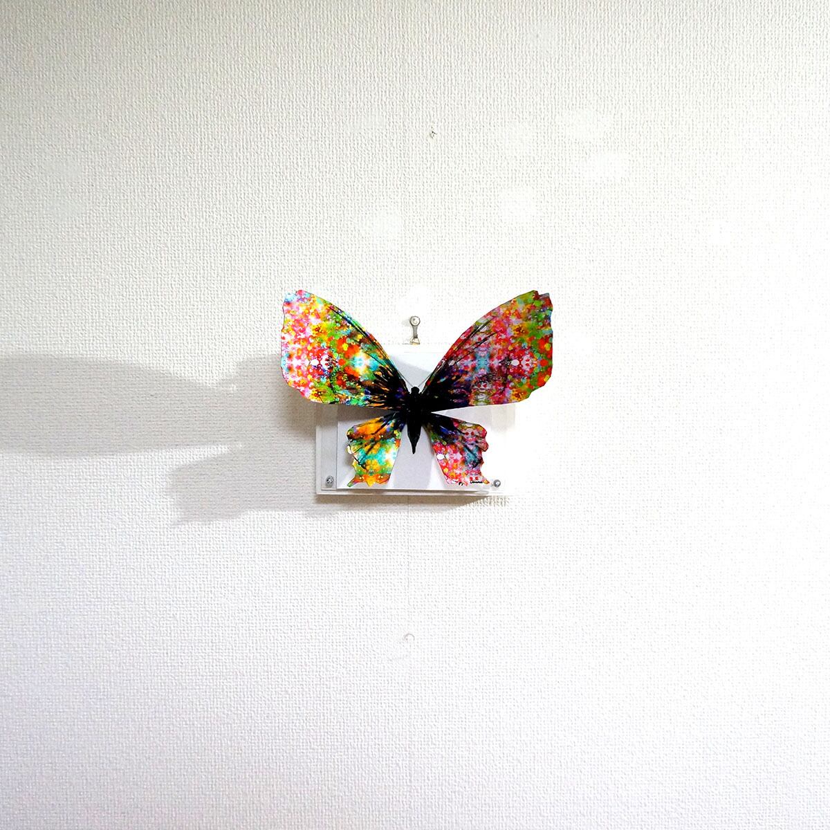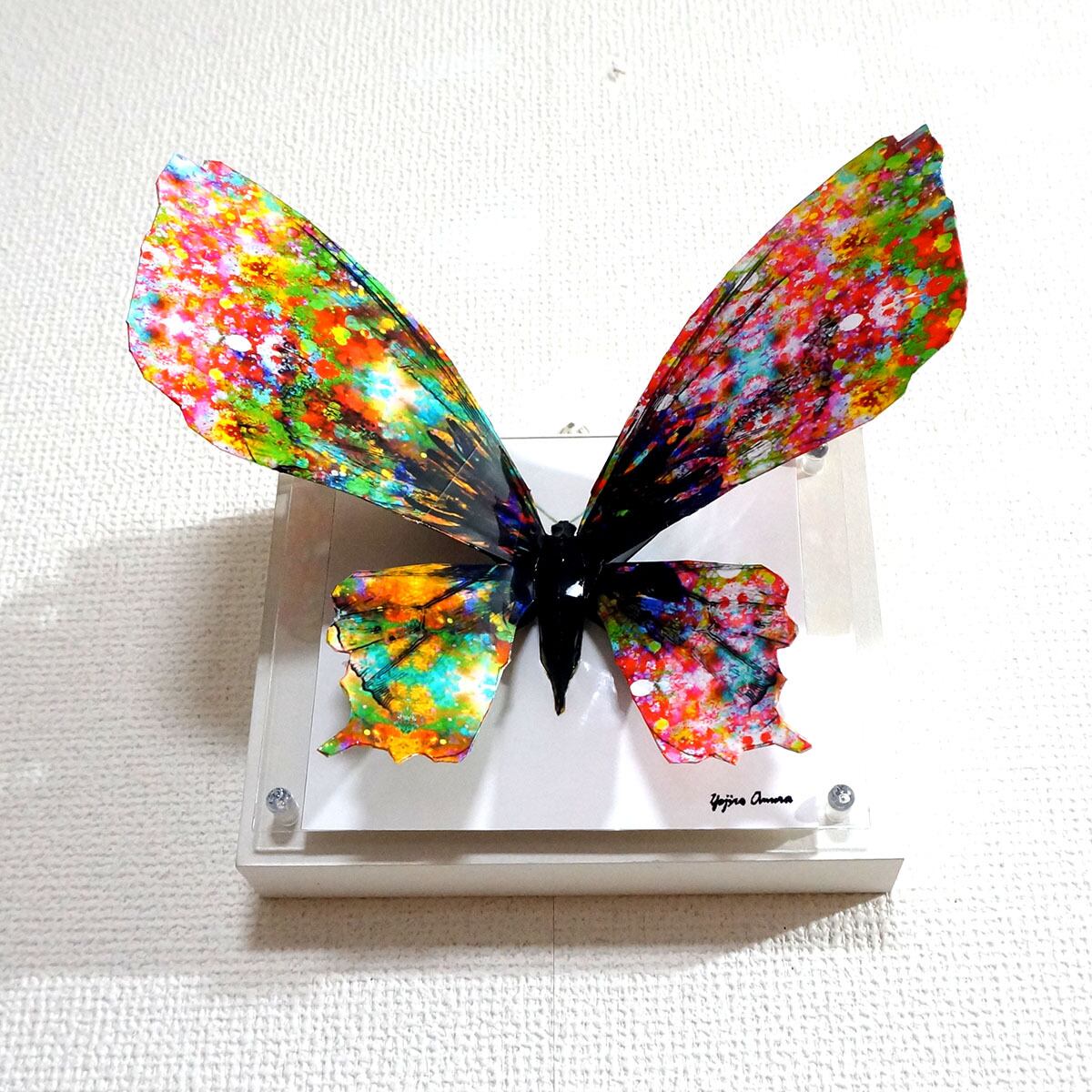 表面デザインはカラフルなカラーの抽象画をイメージしたペイントをチョウチョ本来の模様に重ね合わせて表現しております。表面上は光沢のあるサーフェイスです。