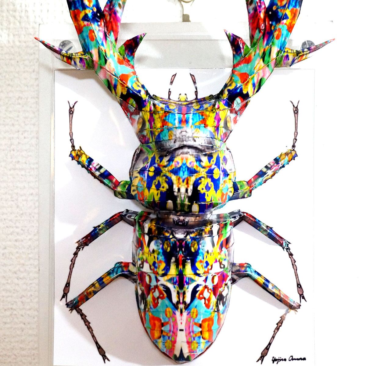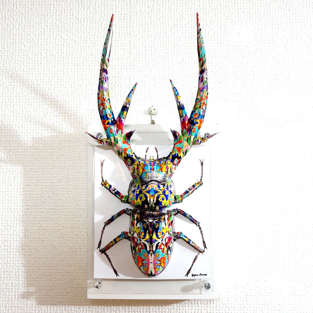 表面上はサイケデリックなイメージのペイントとクワガタ本来の風合いを重ね合わせて表現しております。