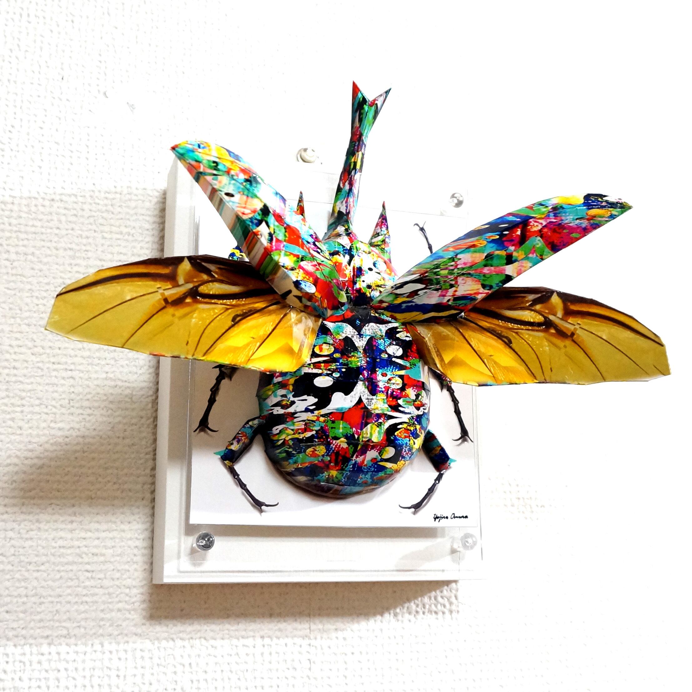 「こちらはペーパークラフト技術を用いゾウカブトムシを立体的に表現した多面化写真彫刻作品です。