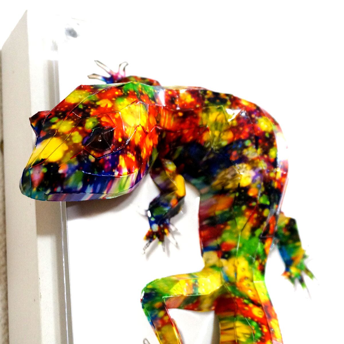 「こちらはトカゲの画像を元にペーパークラフト技術を用いて立体的に表現した多面化写真彫刻作品になります。