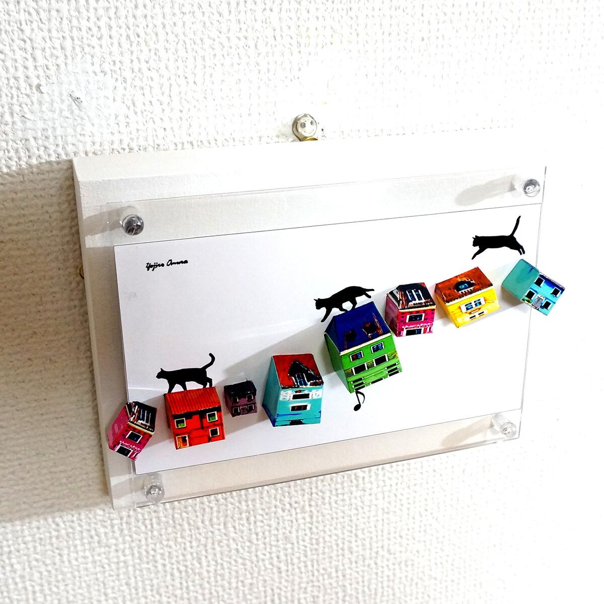 両サイドの家の端をパネルからはみ出させることで、猫たちがそのままパネルの外まで歩いてきそうな予感を感じさせるデザインになっております。