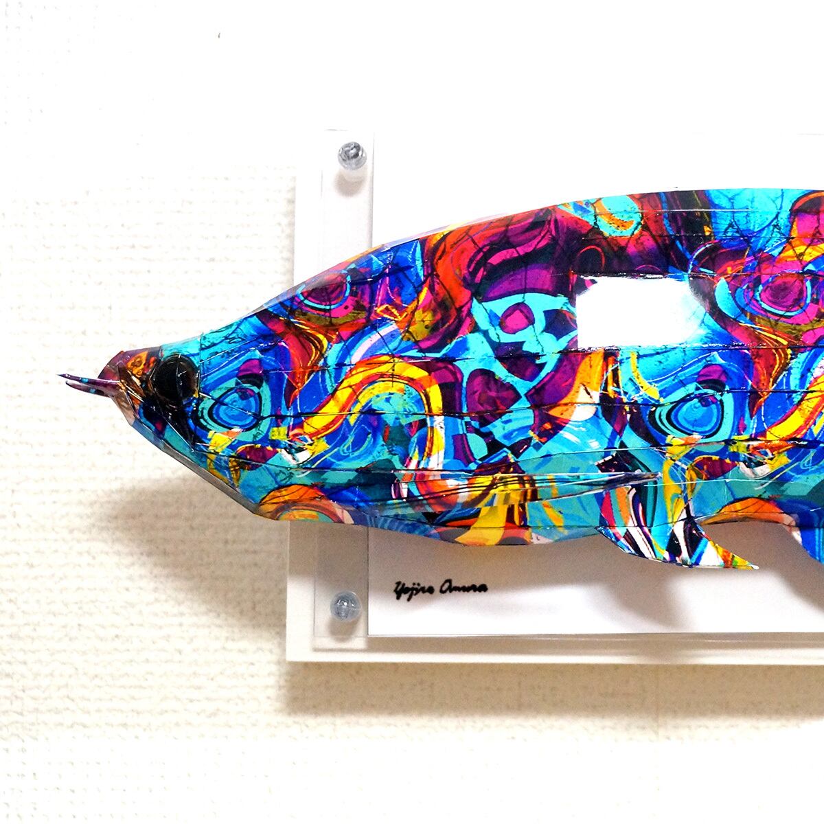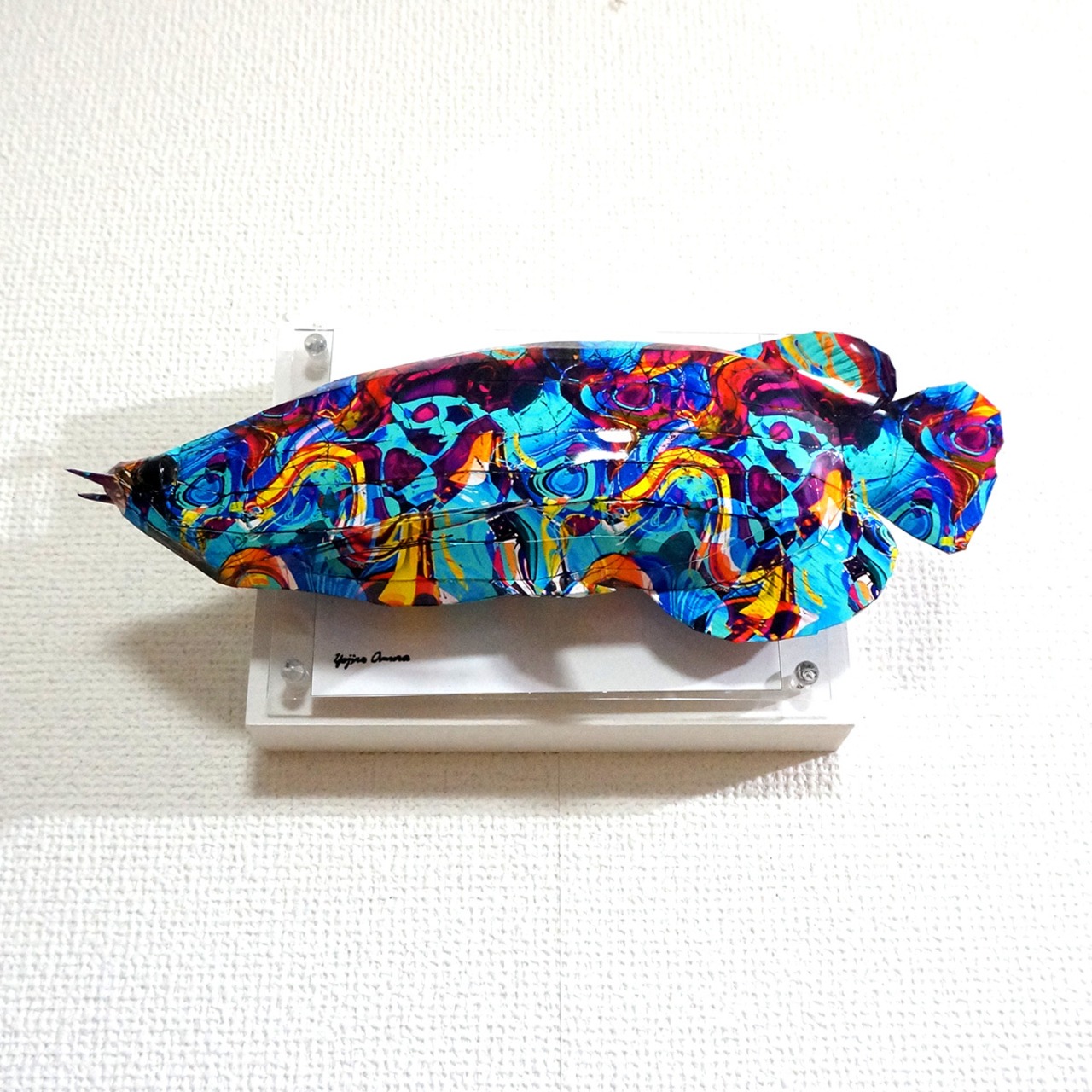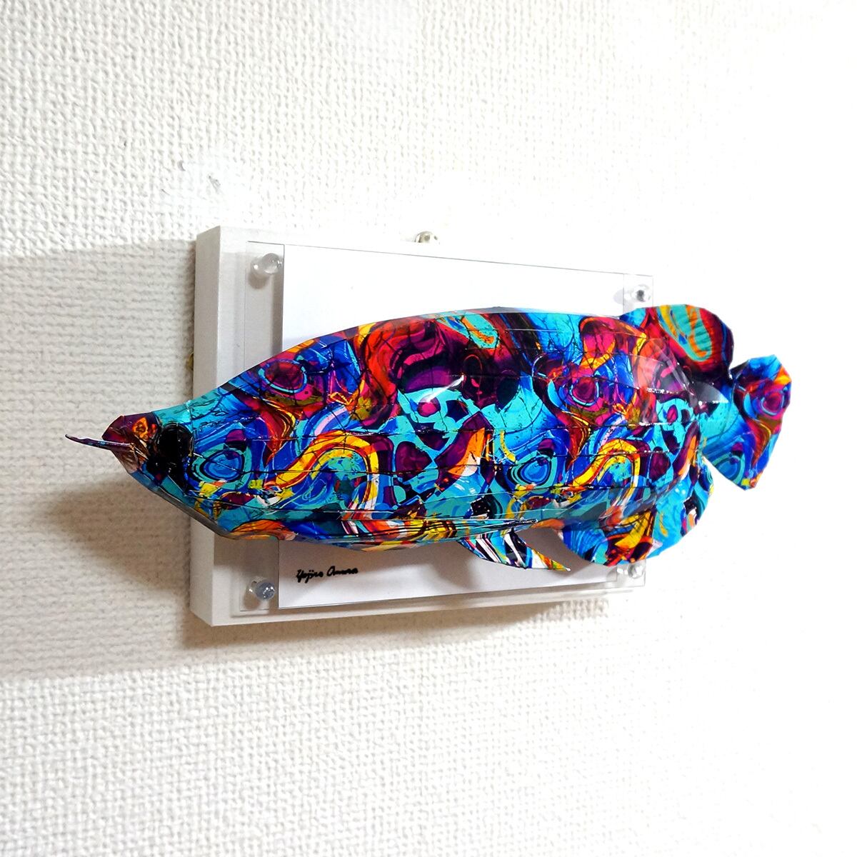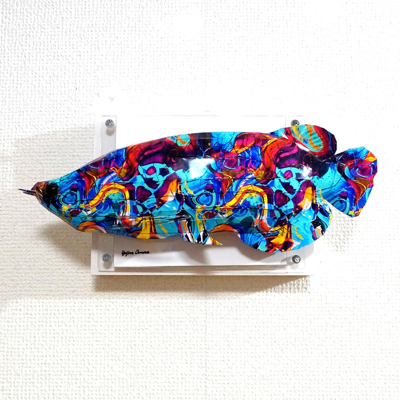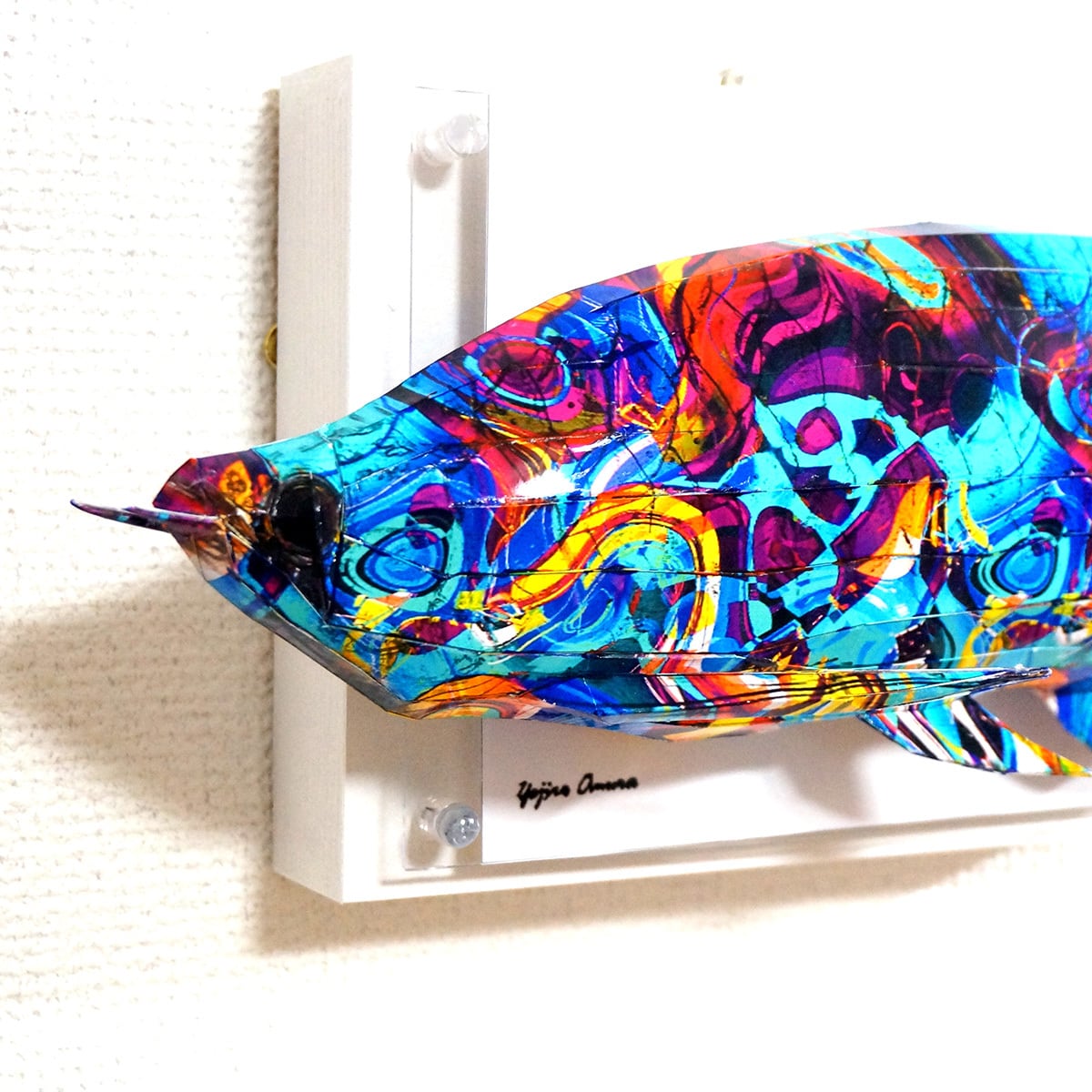 「こちらはアロワナのコラージュ画像を元にペーパークラフト技術を用いて立体化した作品です。