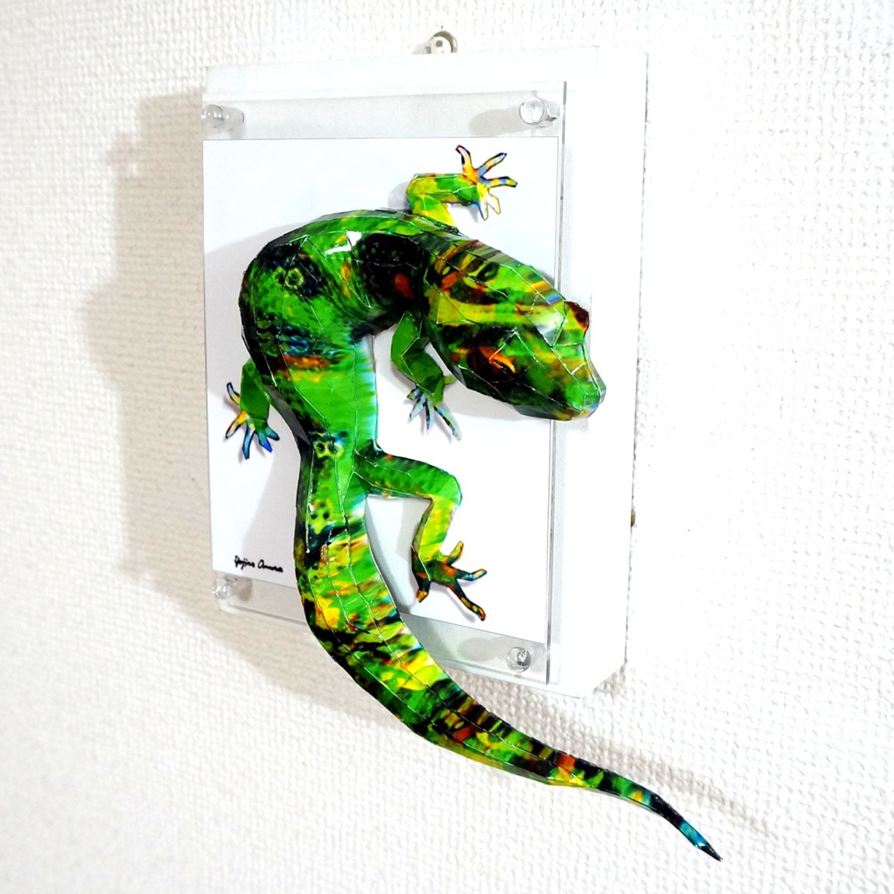 グリーンを基調とした模様のペイントをトカゲ本来の風合いに重ね合わせたデザインです。表面上は光沢紙の艶のある質感です。