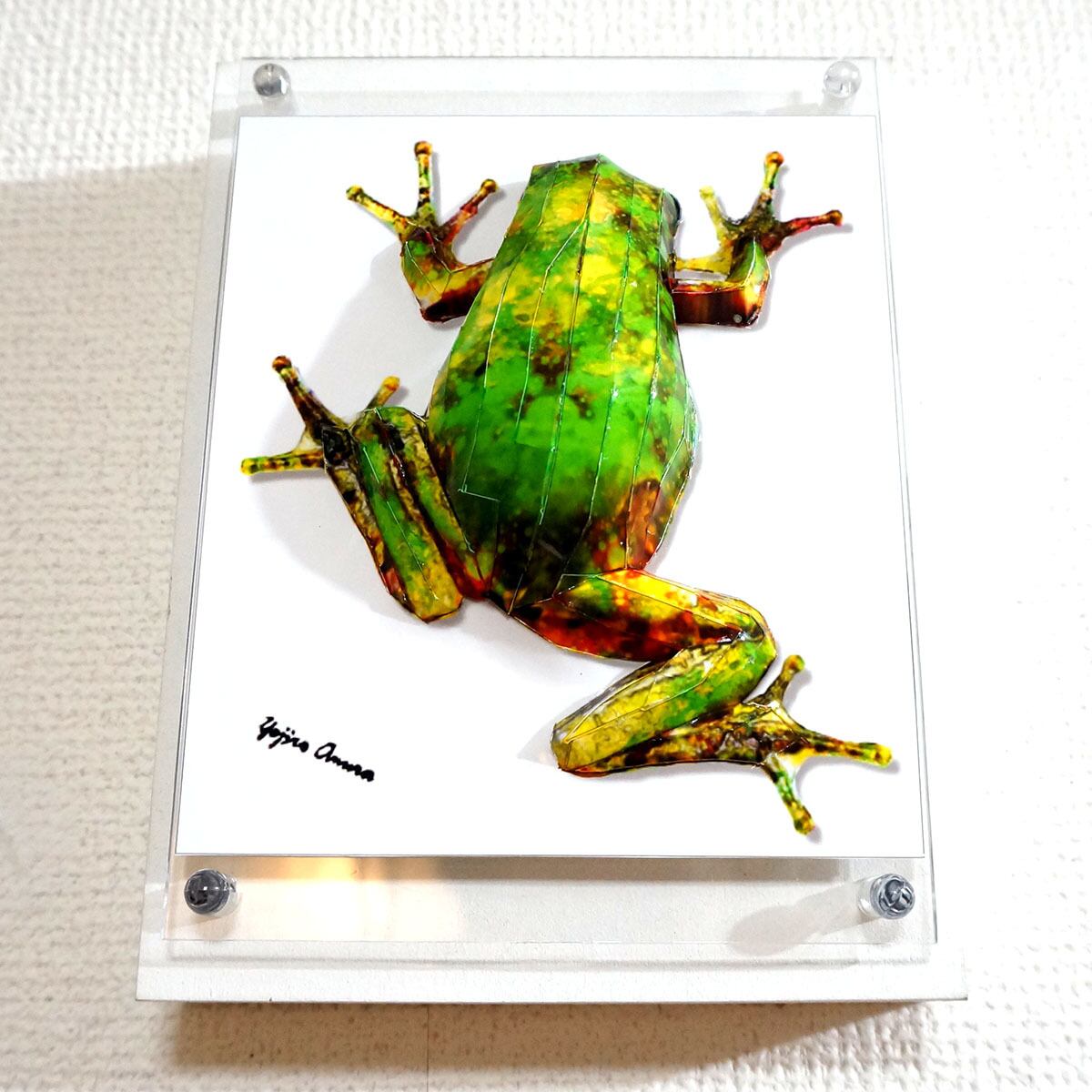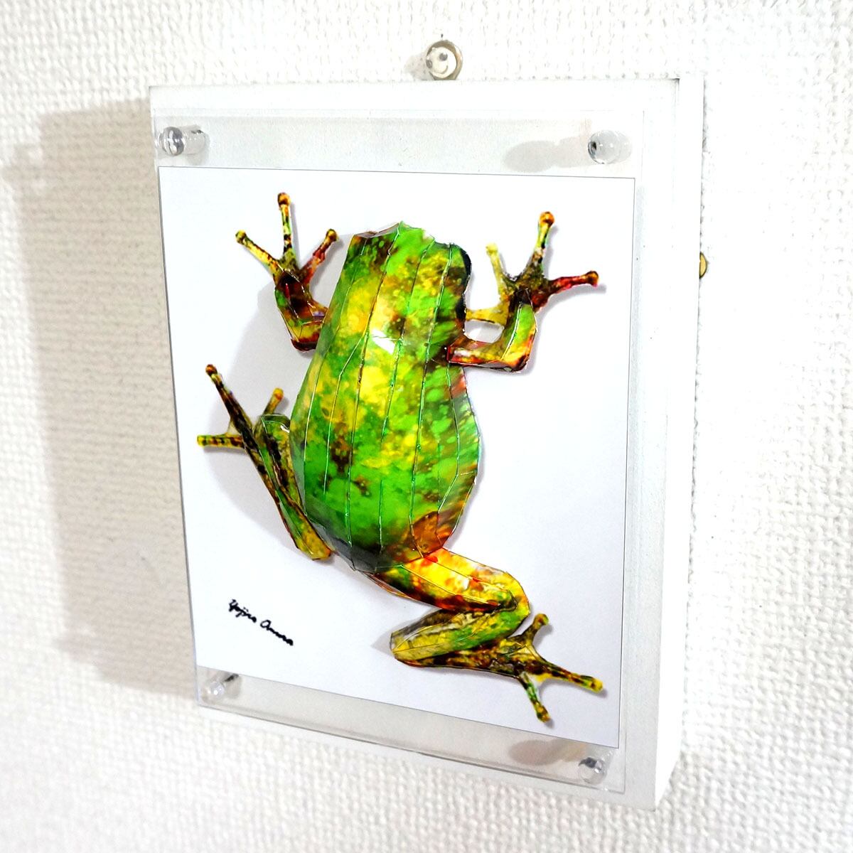 「こちらはアマガエルの画像を元にペーパークラフト技術を用いて立体的に表現した多面化写真彫刻作品になります。