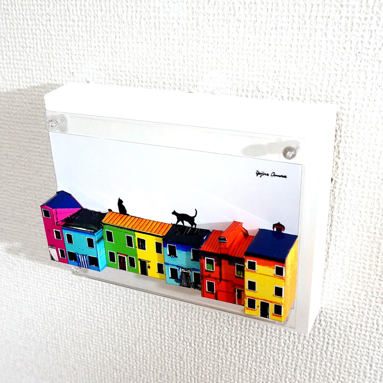 「こちらは二匹の猫が屋根の上で待ち合わせをしている様子を表した多面化写真彫刻作品になります。