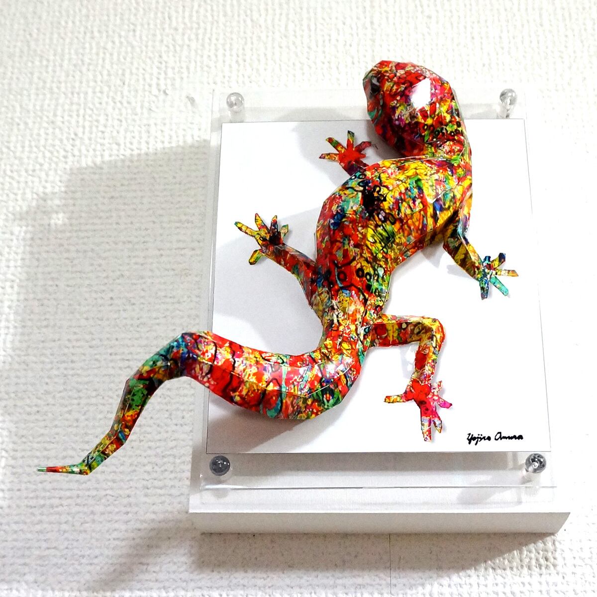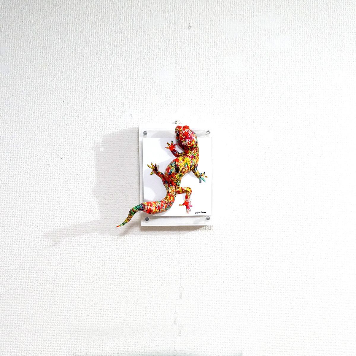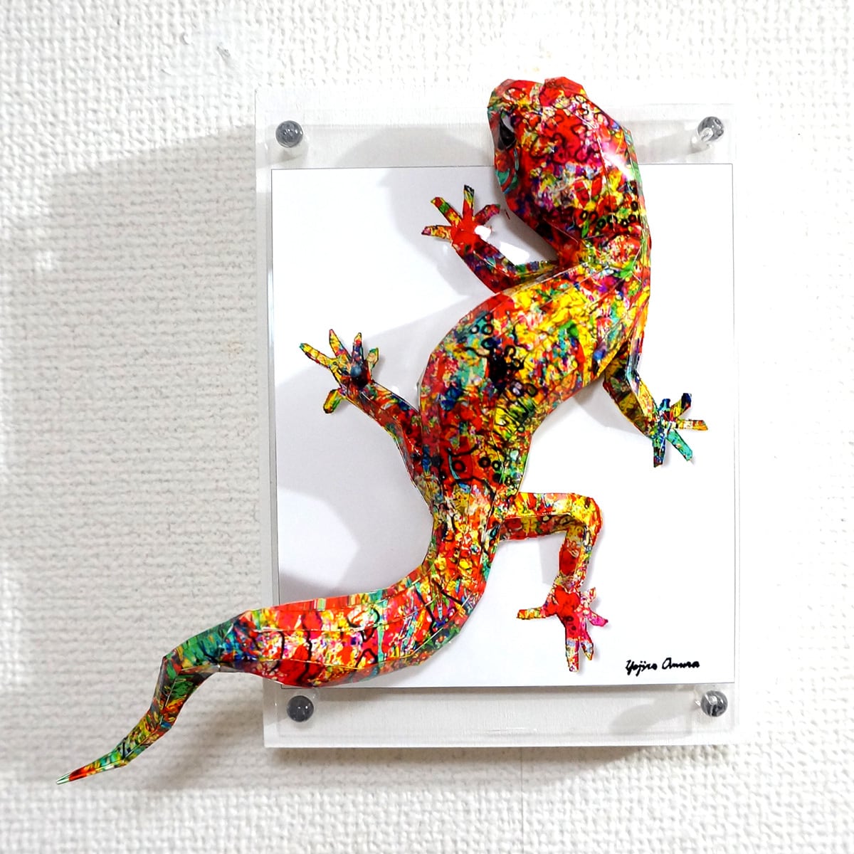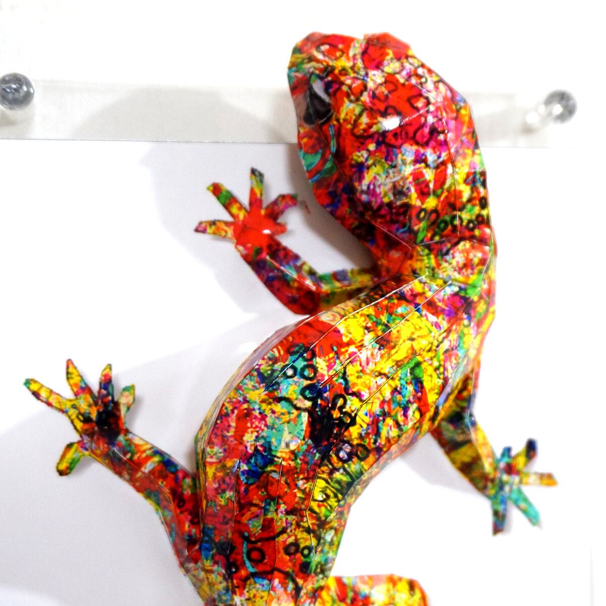 カラフルな抽象画をイメージしたパターンにトカゲ本来の模様に重ね合わせたデザインです。表面上は光沢紙の艶のある質感です。